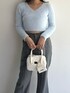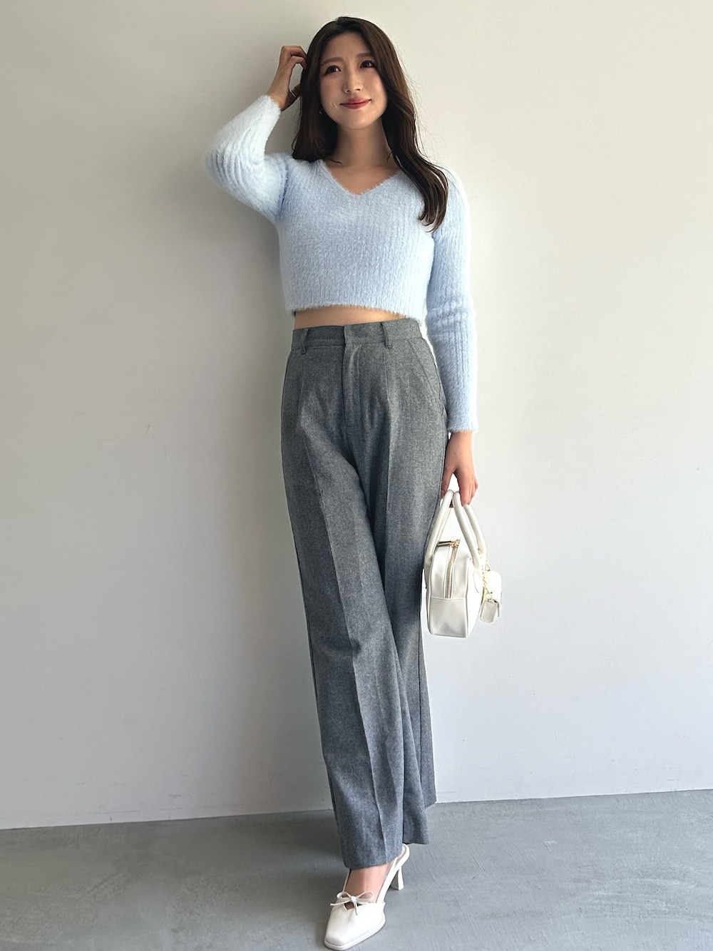 定番のシャギーシリーズに新デザインが登場しました◎ ぴたっとしたクロップド丈とVネックデザインで、膨張感もなくすっきりした印象で着用できます。 合わせたパンツはシーズンムード高める素材感のアイテム。 すっきり細見えするようなシルエットなのもポイントです。