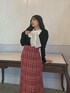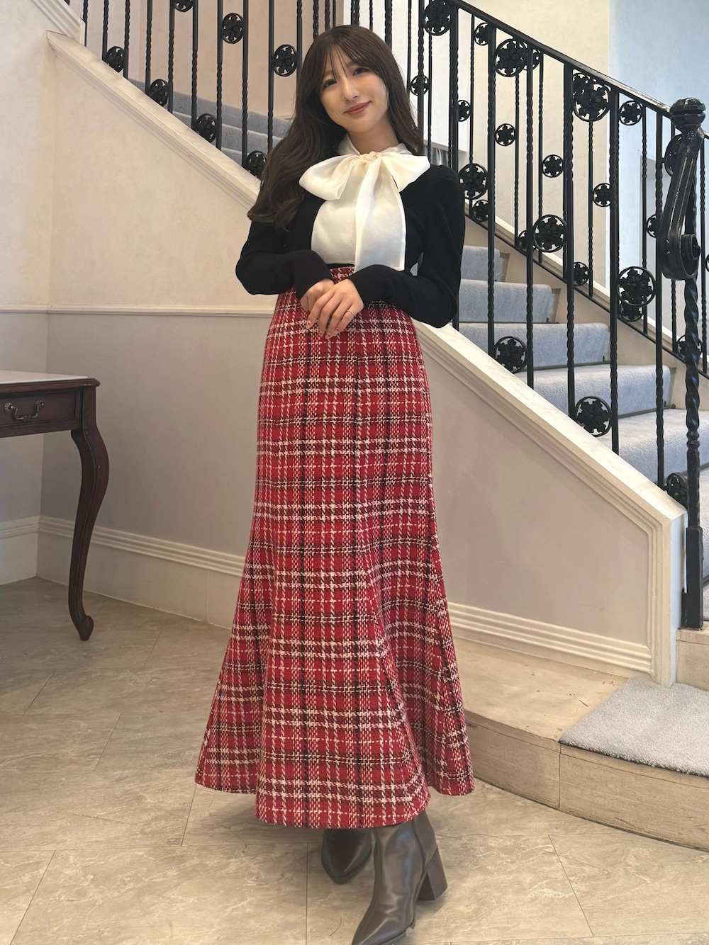 トップスはリボンの結び位置を変えられるので、コーデによって雰囲気を変えて着用できます。 大きめリボンがフェミニンな印象に。 合わせたツイードスカートはレースアップデザインでスタイルアップ効果も◎