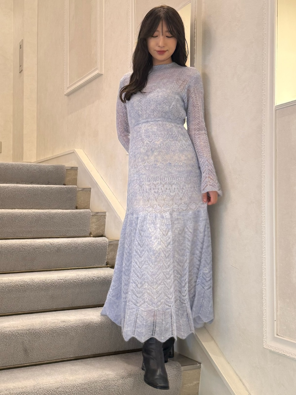 シーズンムード高める冬のモヘアニットワンピース。 透かし編みですがインナーキャミがセットなのも嬉しいポイント。 高い位置での切替と編み柄でのっぺり見えず、スタイルアップ効果◎ 動くたびふんわり広がるスカートのシルエットが上品な印象を演出してくれます。