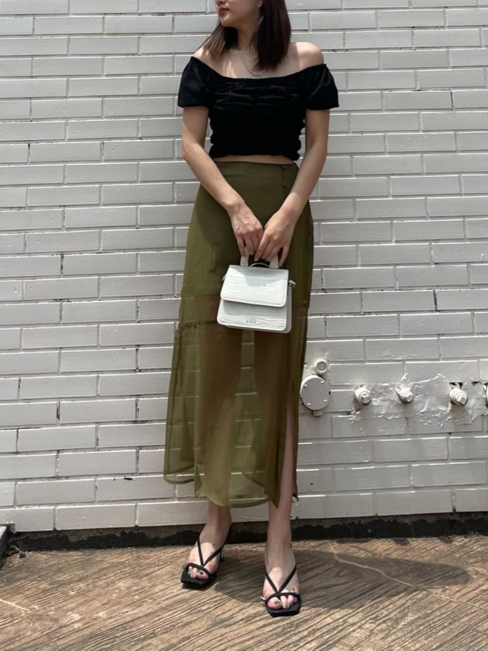 \大人キレイめコーデ♡/ 可愛くなりすぎない合わせなのでデートにもおすすめですよ♡ 【トップス】パフスリーブなので二の腕カバーにもなりスクエアネックとオフショル2wayで着用できます! とても伸縮性のある素材で着やすくシャーリングがある事で女性らしい印象に◎ 胸元部分は総ゴムになっているのでしっかりフィットしてくれてブラウスのように生地感が薄くないので着崩れもしません♪ 厚手のパット付きなのでオフショルでもインナー困らず着て頂けます!デニムに合わせてカジュアルに着ても可愛いですよ♪ 【スカート】今期トレンドのシアースカート!サイドには深めのスリットが入っているのもポイントです♡ サイドジップで着脱できるのでとても楽で生地感もかなり薄手のものになっているので6月頃~9月頃まで着用いただけます♪9月はショートブーツ合わせでも◎ 裏地が短めで164cmの私でお写真位の丈感になります!風で動きが出るのも可愛いですよね☺️ より女性らしい印象にしたかったのでヒールが低めでストラップが華奢なサンダル合わせにしました! クリアヒールにもなっているのでお洒落見えも◎ BAGはあえてコンパクトな物を選びお洋服が目立つようなスタイリングに! ですがホワイトのカラーにすることで差し色になり明るいイメージと清潔感も◎