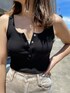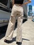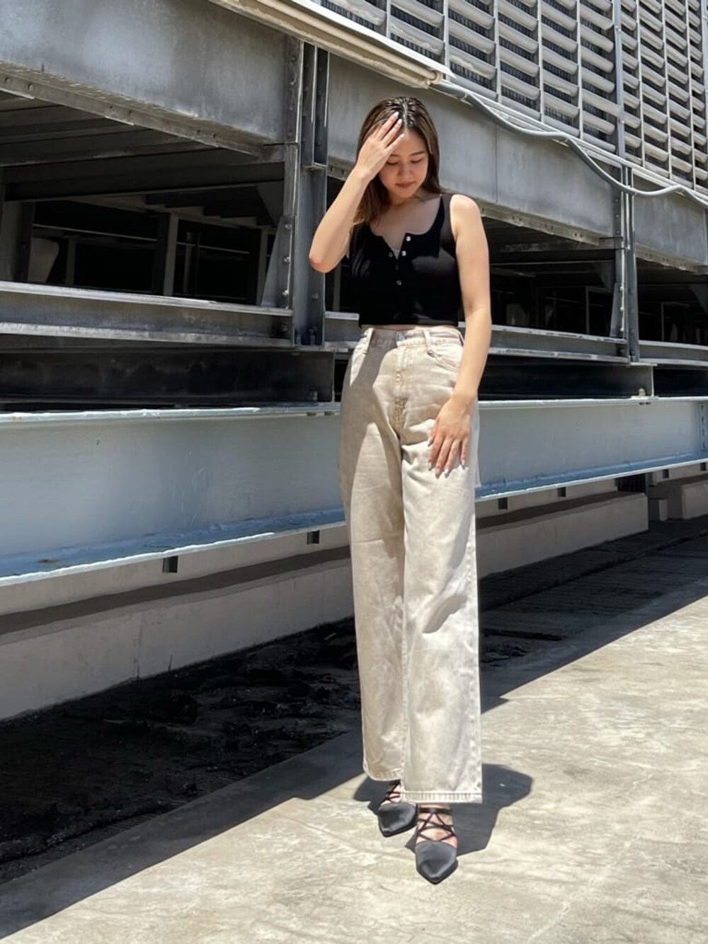 EVRISの復刻デニムコーデ♡ 大人でも履けるダメージワイドパンツのスタイリングをご紹介!! 【トップス】ボトムスがゆったりしたシルエットなのでトップスはできるだけフィット感のある物でバランスをとるのが◎こちらのタンクトップはフロントボタンデザインで自分でVネックに調節出来るのがポイント!伸縮性もありショート丈なので1枚あればインナー使いにもできますよ♪ 【ボトムス】大人気デニムのバックスラッシュワイドパンツはベージュ系を選ぶ事でダメージが施されていてもカジュアル過ぎずに履いていただけます♡ なによりシルエットが凄く綺麗でワイドパンツなのに細見え効果&脚長効果の出るシルエットにこだわっているのでスタイル良く見える神デニム!! バックのクラッシュもそこまで大胆では無いので肌見せ抵抗ある方でも挑戦して頂きやすいと思います♡ 163cmの私でSサイズでスニーカー合わせができる丈感です! 足元はあえてミュールを合わせる事で大人らしさをだしつつカジュアル過ぎないようにまとめて見ました♡
