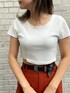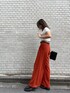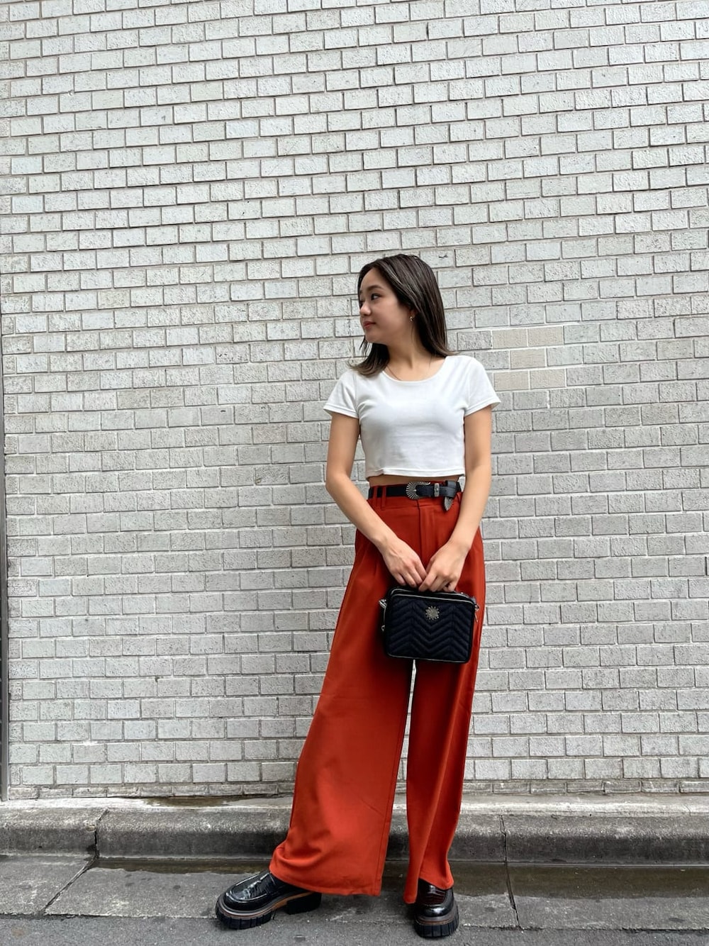 カラーパンツを使った大人カジュアルコーデ♪ 【トップス】EVRIS定番アイテムのシンプルショートTEEはハイウエストのボトムスと相性抜群なので何枚合っても使える優秀アイテム! 二の腕部分に少し隙間が出来るので華奢見えします♪ 小さめな作りなのでワンピースやオールインワンのインナーとしても◎ 【パンツ】ジョーゼット素材を使用したワイドパンツは腰周りから広がりすぎずにストンっと落ちるシルエットなのでとっても縦ラインが綺麗です! かなりのハイウエストなので美脚効果も◎ 生地感も厚手過ぎないので真夏以外は着用頂けてサラッとした肌触りになります♡ 大人っぽい深みのある色なのでカラー物に挑戦しにくい方でも馴染みやすいお色味になっています♪ 大人カジュアルにまとめたかったのでヒールではなくあえてローファーを合わせる事でカジュアルさも出しつつ大人っぽい印象に! 7cmのヒールがあるのでさり気なくスラッと見せれますよ♡ これからの季節はライダースでかっこよく合わせるのもオススメです♪