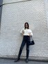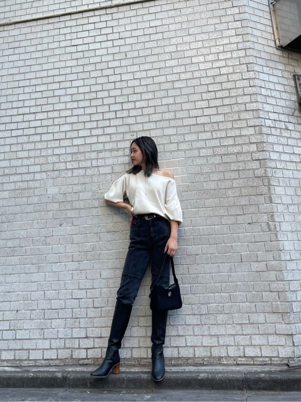ミドルブーツを主体とした大人コーデ♡ 【トップス】レーヨンが50%入っているのでとっても柔らかくモチっとした素材のニット! 私はワンショルで着ることで女性らしい印象になるようスタイリングしましたが肌見せ気になる方はボートネックとしても着用頂けます◎ 袖のボリューム感が可愛く、二の腕カバーもできるのでお気に入りです♡シンプルなデザインなのでどんなボトムにも合わせられます♪ 【デニム】ストレートデニムなのでピタッとしすぎず骨格カバーできるデニム! 切り替えデザインがある事でひざ位置が高く見え美脚効果も◎ウォッシュブラックが加工感あっておすすめ♡ もちろんオールシーズン履いて頂けるデニムです♪ 私はX脚が気になりますがこれなら足のシルエットがカバーできるので挑戦しやすい♡ 【ブーツ】ミドルブーツだとショート丈合わせが多くなりがちですが、大人っぽくカッコイイスタイリングにしたかったのでデニムインの合わせにしてみました♪ EVRISのブーツはとても軽く、ふくらはぎの部分も生地がとっても柔らかいので履きやすくウッドヒールが他にはなくオシャレ度アップ♡ 傾斜も気にならないくらいクッション性があって柔らかい履き心地です!