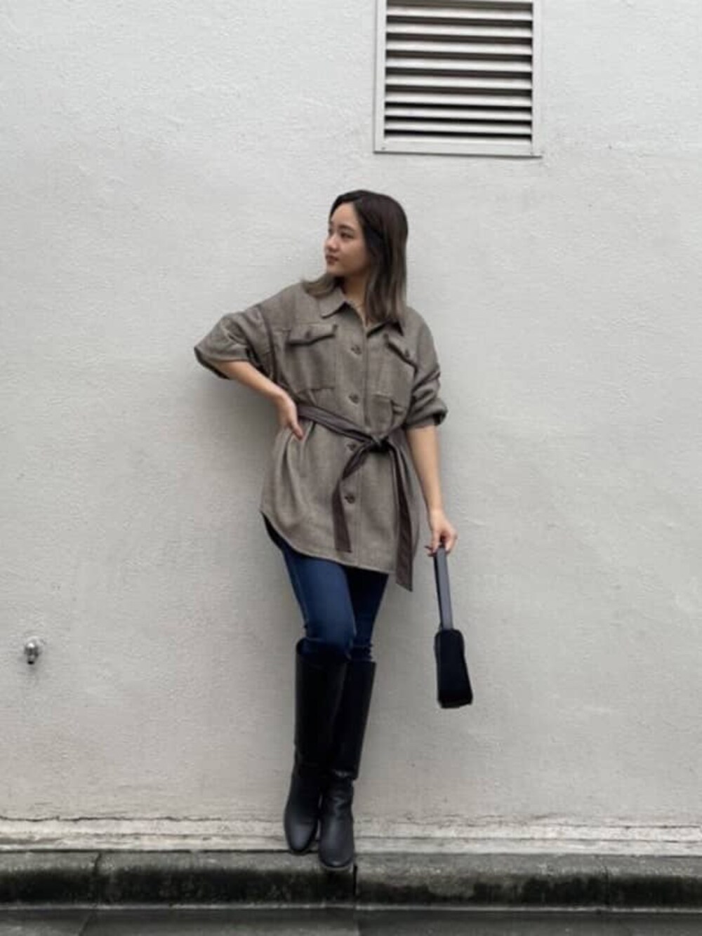 ジャケットを主体とした大人コーデ♡ 【アウター】ツイード素材のジャケットは見た目よりもとっても軽く軽衣料なので10月、11月に1番羽織りやすい素材感になっていますよ♪ ジャケット特有のカッチリ感もなく動きやすい◎ 163cmの私でヒップが隠れるくらいの長さまであるので低身長の方はワンピース風でも着ていただけます! 付属のレザーベルトもついているのでウエストマークも出来ちゃいます◎ 私はキレイめにまとめたかったのでスキニーデニムにミドルブーツを合わせることで大人っぽい仕上がりにしました♡なのでジャケットのカラーをブラウンにすることでカッコ良くなり過ぎないようにスタイリングしました♪ 【ブーツ】履いたら驚きの柔らかさと本当に1日履いていても楽なくらいクッション性が◎ ウッドヒールなのでそれだけで大人っぽい印象になります♪