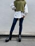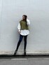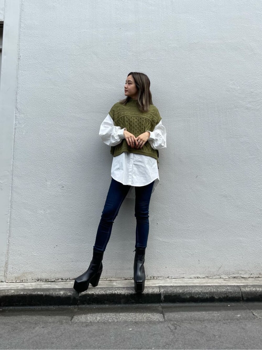トレンドのグリーンニットを使用したレイヤードスタイルをご紹介!!! 【ニット】ケーブルニットはベストタイプと長袖タイプがセットになっていて別々でもお使い頂ける2wayニット!!今回はベストタイプのスタイリングをしてみました♡ 丈感は短めになっていてサイドに紐が付いているので横幅のサイズ感も調節可能になっています! 私はシャツとレイヤードしましたが、ロンTとレイヤードしてカジュアルコーデもオススメです♪ 【デニム】トップスにボリュームがあるのでボトムスはタイトにスキニー合わせにしました! こちらのデニムはストレッチがかなり効いていて 細見え効果が凄いんです!! オールシーズン使えるアイテムなのでスタッフみんな1本は持ってるくらい愛用されてます♡ 【ブーツ】 大人気のチャンキーブーツ!ヒールは12㎝ほどありますがソール部分も高いので安定感があり本当に疲れにくいんです♪ブーツインをすると脚長効果がすごくありますよ!ワンピやスカートにも相性抜群です♡素材は合皮なので、春先にも可愛いですよね♪店頭でも大人気のブーツです! 普段シンプルなお洋服が多い方でも、 カラーニットを差し色にするだけで大人カジュアルなスタイリングに♪