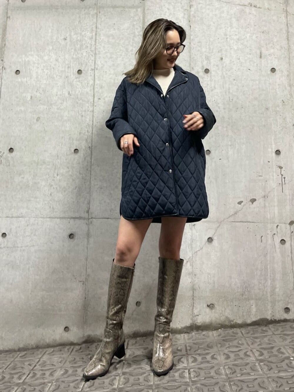 【アウター】 キルティングブルゾンとライダースブルゾンが2点SETになっていて別々でも使えるアイテム! キルティングブルゾンはとっても軽くて他のアウターのインナーとして使うのも◎ ライダースブルゾンはかっちり綺麗めな印象になるのと襟が大きめに開くので顔周りスッキリ! 【シューズ】 24.5cmでLサイズ着用。 パイソンのミドルブーツ合わせで他と差のつくコーデに♡ 7.5cmヒールですがクッションがかなりしっかり入っているので足への負担が軽減されてます!