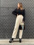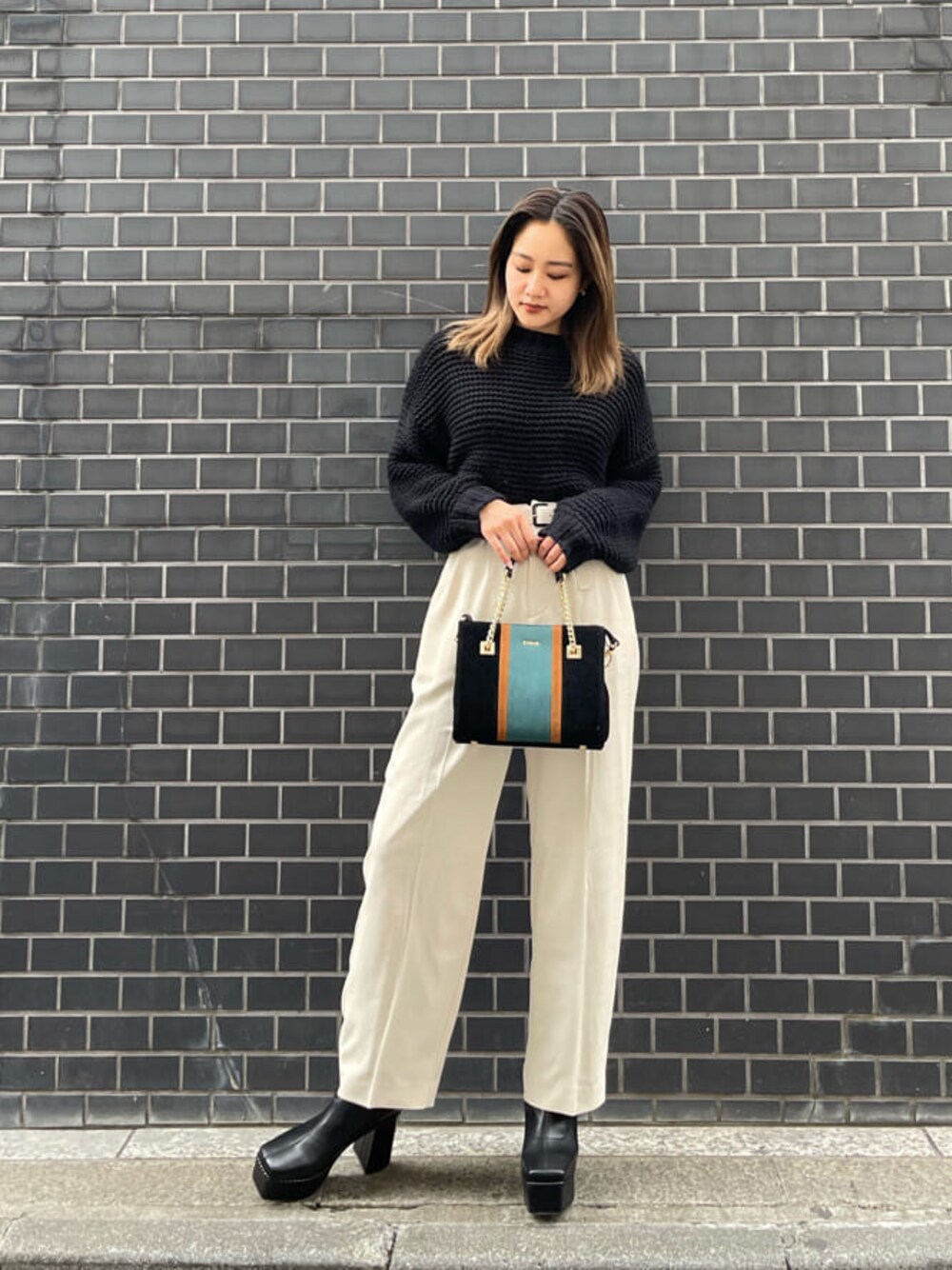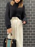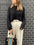 【ニット】大きな編み目がポイントのガーターニット!かなりのショート丈と長めの袖丈とのバランスが◎首周りもスッキリしてます! 【パンツ】ウエストベルト付きでサラッとした生地感のパンツ!ボディラインをカバーしてくれるので着痩せ効果◎164cmの私でSサイズでしたらスニーカー合わせも可能です! 【バッグ】カラーブロッキングがポイントのバックは収納が2つに分かれているので実用性◎ もちろんショルダーも付いています! 【シューズ】24.5cmでLサイズ着用。