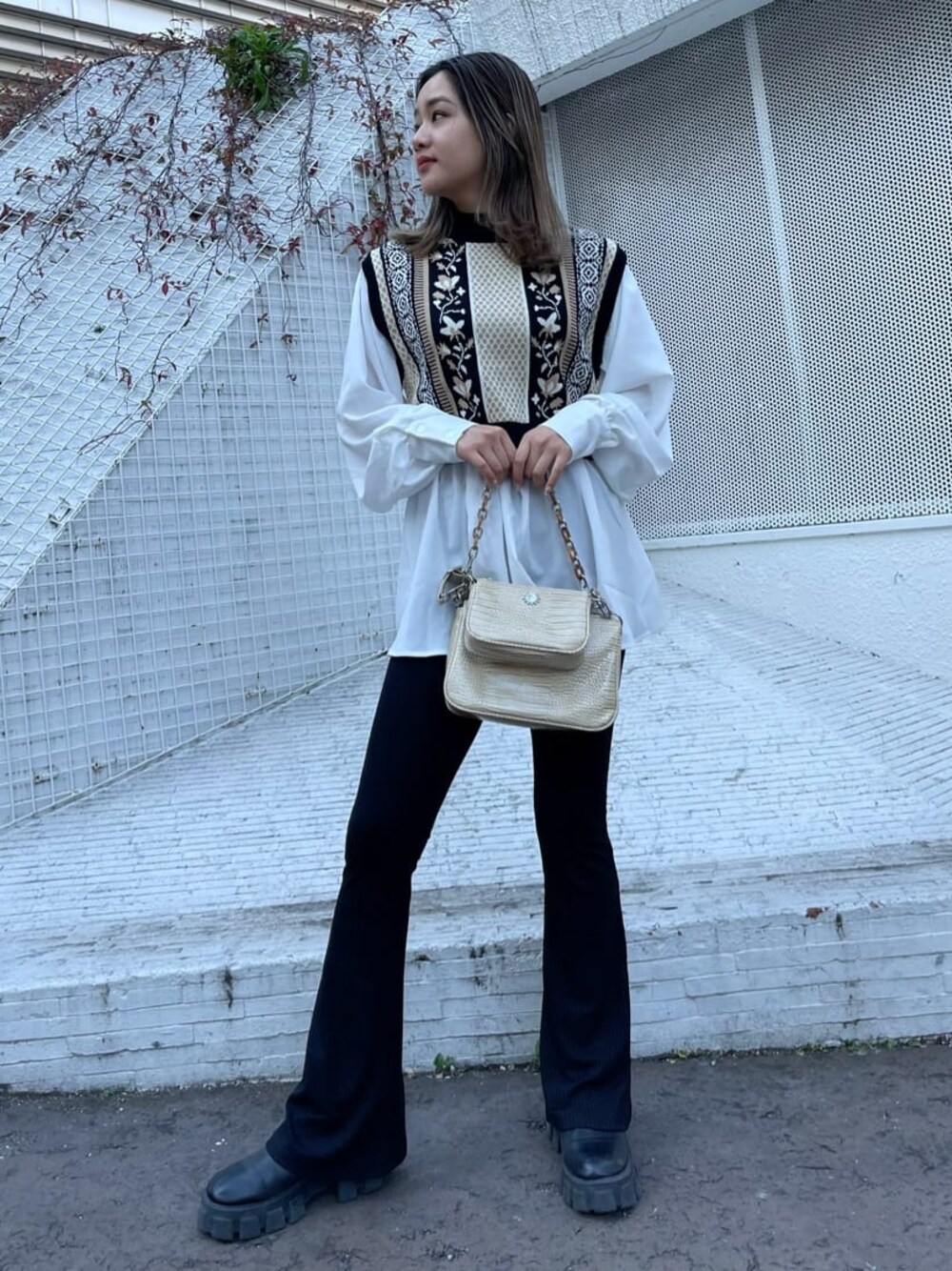 【トップス】オリジナルのジャガード柄がポイントの ニットベストとシャツワンピの組み合わせ♡ シャツはテロっとした素材で肌触りよく、少し透け感のある作りになっています! 高身長の方はフレアレギンスの合せがおすすめ◎ 【パンツ】EVRIS定番人気のリブフレアレギンス! 縦のリブが脚を長く綺麗に見せてくれる! 王道人気♡ 【シューズ】24.5cmでLサイズ着用。 【バック】ツインズショルダーBAG! ベルトタイプのショルダーも付いてるので2wayでお使い頂けます♡ 長財布も収納可能です!