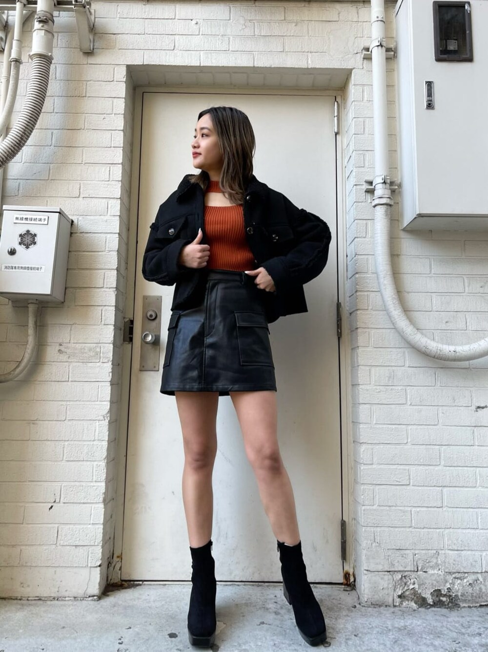 【トップス】フロント部分がざっくり開いたタイトなトップス! 下着は見えない作りになっているので1枚で着用でき、タイト目ですが伸縮性があり着やすくなっています♪ リブが大きめなので細見え効果◎ 【スカート】インナーショーパン付きのスカート! 少し裾広がりなので1番脚を綺麗に見せてくれる仕上がりです♡ 【アウター】ショートボアブルゾン! 柔らかい素材なのでボアでも動きやすさ◎ 短丈なのでハイウエストのボトムスと相性抜群です! 【シューズ】24.5センチでLサイズ着用。