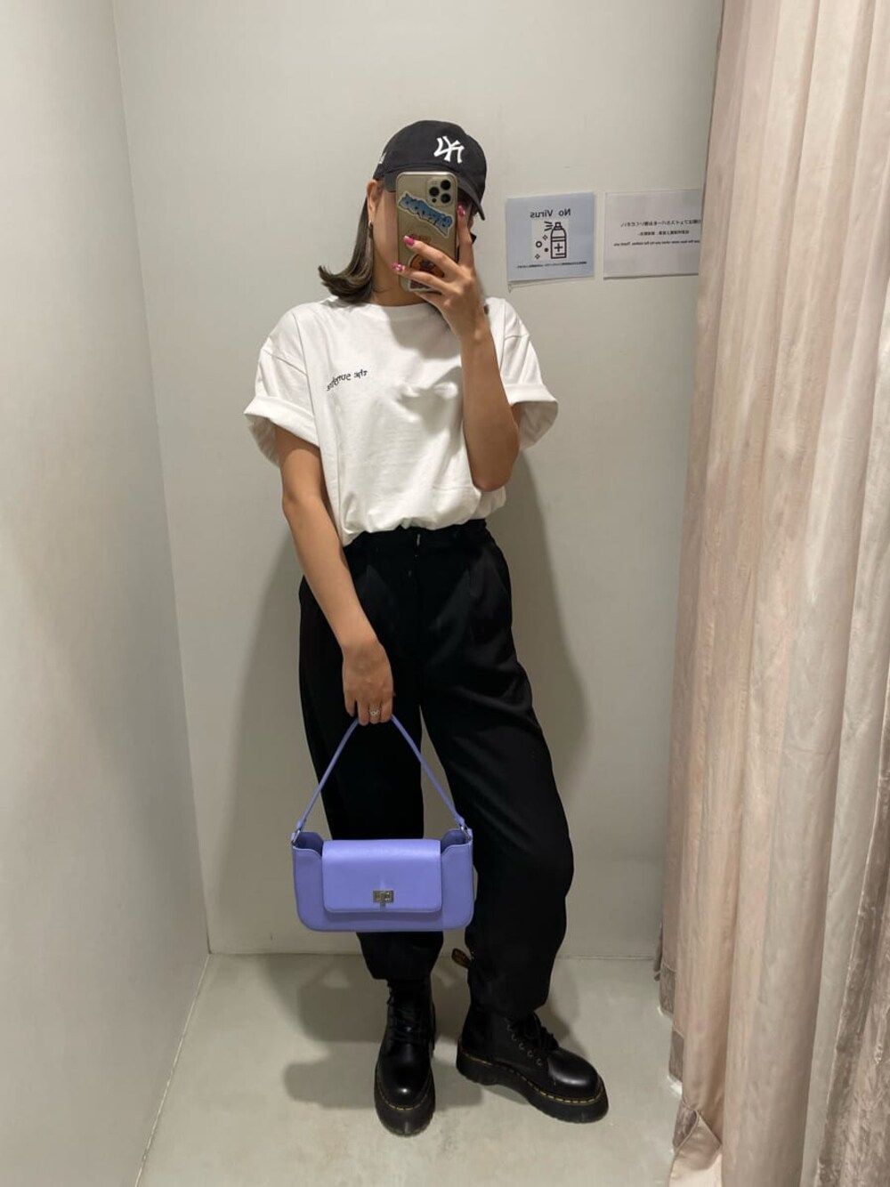 【トップス】 パックプリントのオーバーサイズTシャツ♡ EVRISのサニーモチーフが可愛く、153cm位の方まではワンピースとして着用頂けるゆるっとしたサイズ感になっています! 袖丈も長めなのでロールアップが可愛い♪ 【パンツ】 細身なシルエットのジョガーパンツ! 裾はゴムになっているのでブーツインもしやすく、 サラッとした素材なので履きやすさ◎ デニムが苦手な方のカジュアルコーデにおすすめです♡164cmで踝くらいの丈感です。 【ブーツ】24.5cmでLサイズ着用です。 【BAG】長財布も入る横長のサイズ感です。