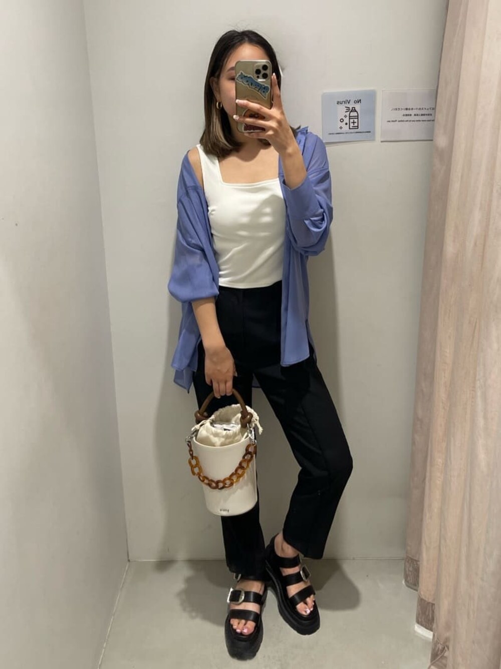 【夏のお出掛けコーデ♡】 【シャツ】少しラメ感のある素材なので大人っぽい印象に◎オーバーサイズなので164cmの私でもヒップが隠れるくらいの長さになっています! 梅雨の時期にも大活躍ですよ♡ 【インナータンク】スクエアネックなので顔周りがスッキリ見えカップ付きなので1枚で着用可能です♪ 【パンツ】S.Mの2サイズ展開です。 164cmでSサイズだと踝ぐらいの丈感です。 センターラインで足が真っ直ぐ見え、裾に向かって細くなりとても綺麗なシルエットで着用できます♡ 【バッグ】500mlのペットボトルが縦で入るくらいの大きさです!持ち手が3wayからお選び頂けます♪ 【シューズ】24.5cmでlサイズ着用です。
