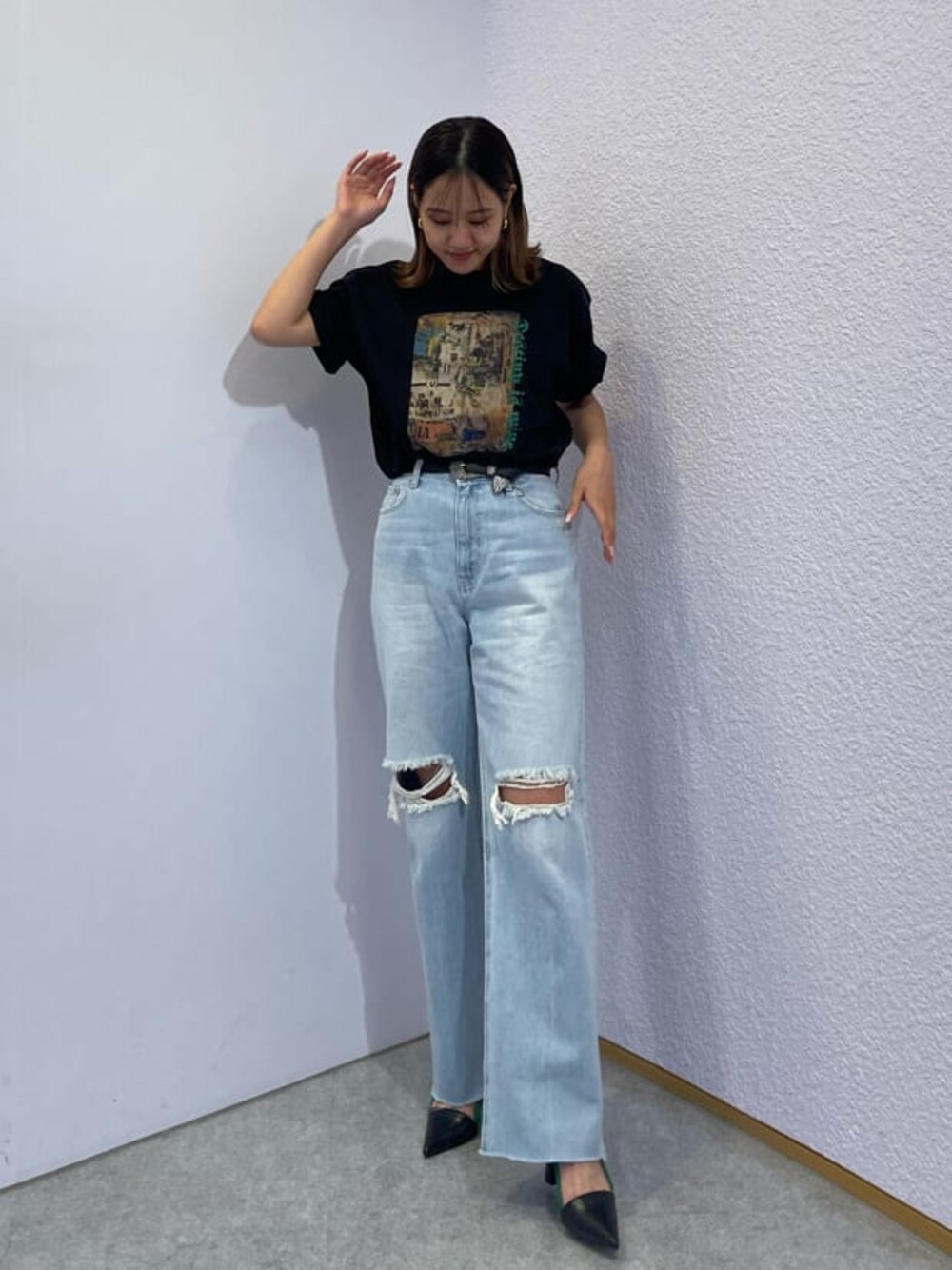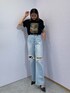 【20代後半が着るカジュアルコーデ♡】 【トップス】 フロントにヴィンテージ感のあるプリントが施されたBIGTシャツ!!164cmの私でもヒップが隠れるくらいの長さです!デニムと合わせてカジュアル感強めに着るのも可愛い♡ 【デニム】 大胆なクラッシュがトレンド感のあるワイドデニム! 膝下からさりげなくセンターラインがあるのでクラッシュから下が長く見えスタイルアップ◎ 164cmでSサイズでスニーカー合わせで着用できます! 【シューズ】 24.5cmでLサイズ着用です。