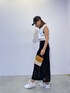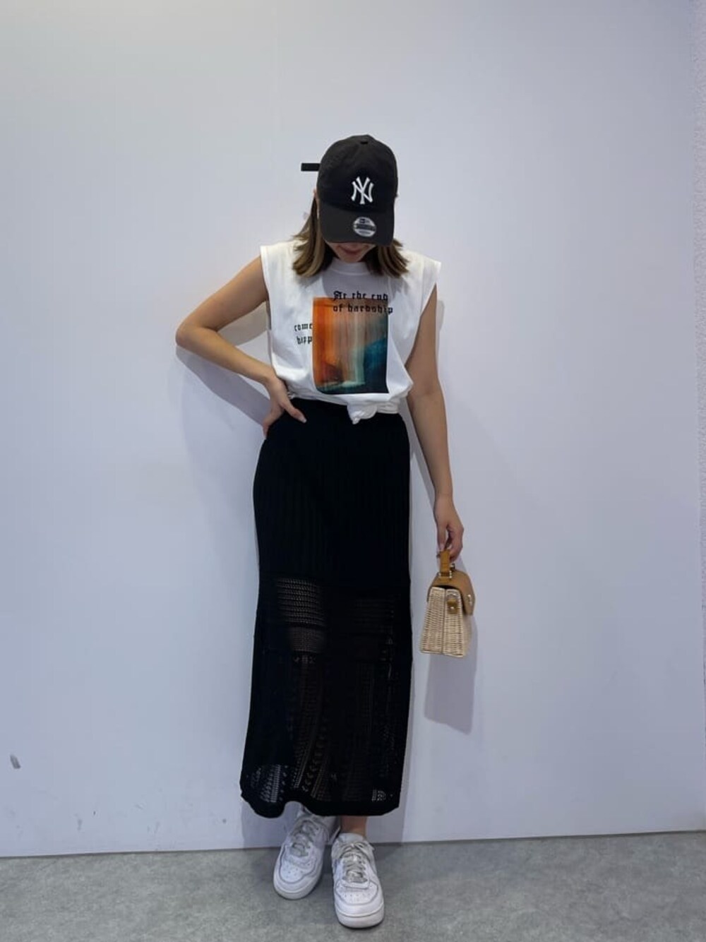 【綺麗め×カジュアルコーデ】 【トップス】 フロントプリントのノースリTシャツはロング丈なので164cmの私でもヒップが隠れる位の長さになっています!なのでボトムスにインをしてトップス風で合わせて見ました♡キャミソールとは違いボックス型なので肌見せが軽減でき二の腕が気になる方でも挑戦しやすいシルエットなのでおすすめです♡ 【スカート】 透かし編みのスカートなのでロング丈でも涼しい印象に◎ ウエストも総ゴムなのでストレスフリーで着用頂けます! 164cmでくるぶしちょっと上めなのです♡ 【BAG】 夏らしいラタン素材でハンドでもショルダーでも2wayでお使い頂けます♪