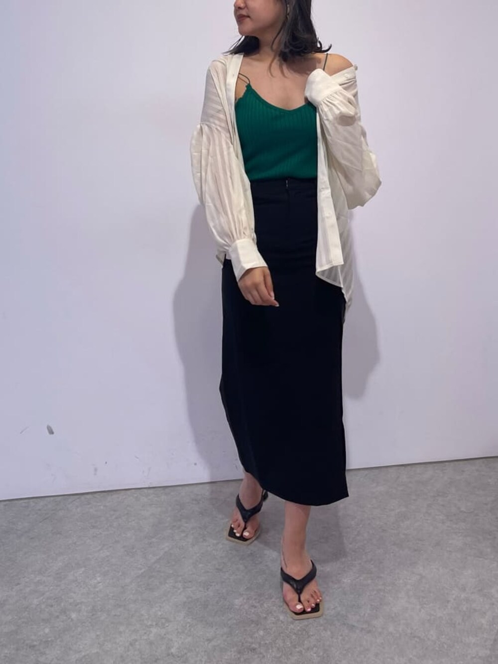 【ラフな綺麗めコーデ♪】 【キャミソール】 ベーシックなデザインのキャミソールでショルダーは細めのダブルストラップになっています! ニット素材なので伸縮性がかなりあり着心地も◎ 【シャツ】 さり気ないストライプデザインのシアーシャツ! 164cmでもヒップが隠れる位の長さなので体型カバーにもなり着回し抜群です♪ ポリエステル100%なのでシワにもなりにくくなっています! 【スカート】 腰周りがタイトめですかウエストはゆとりのあるデザインなので冬にニットもインしやすいです! スリットは164cmで膝上15cm程になります。 【シューズ】 24.5cmでLサイズ着用です。