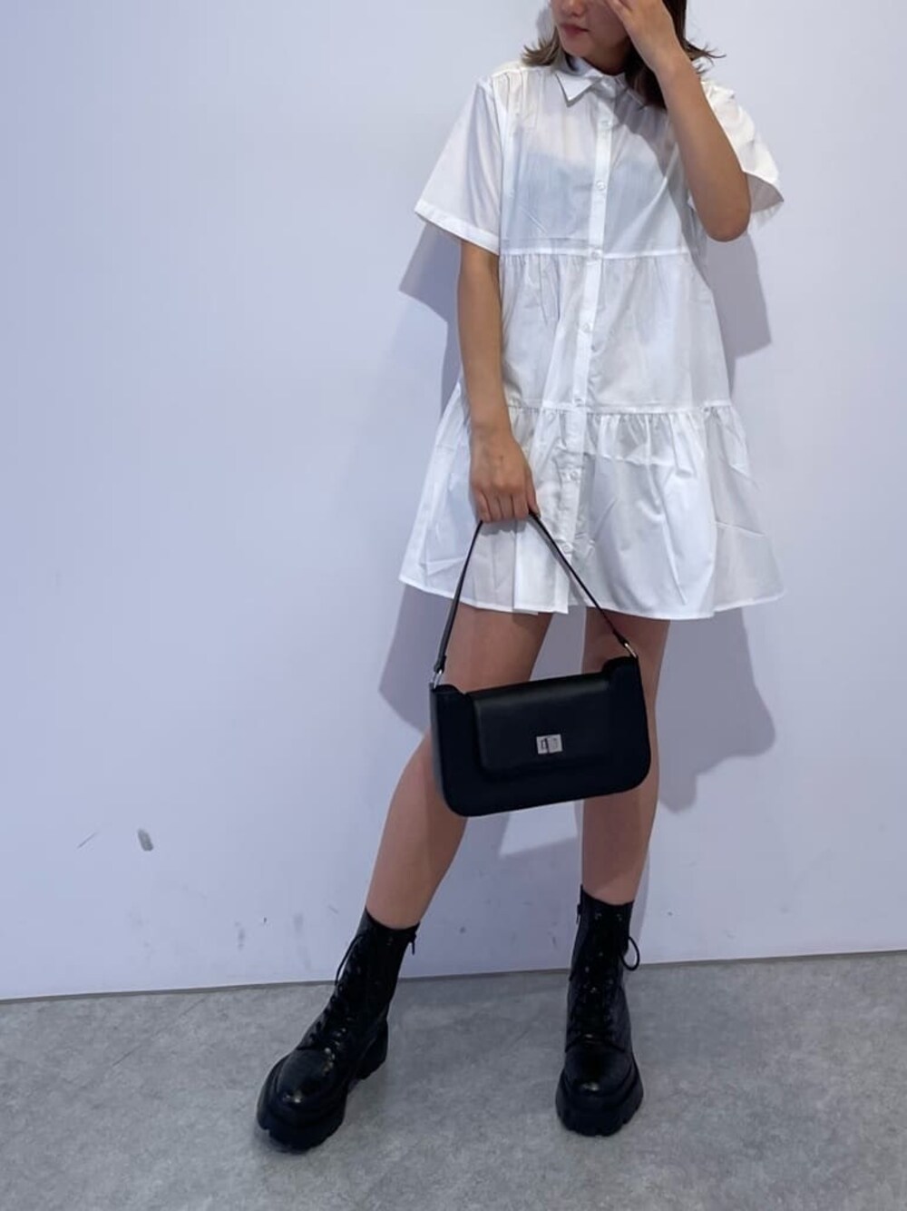【ミニワンピースを使ったカジュアルMIXコーデ☺️】 【ワンピース】 164cmでしっかりヒップが隠れるのでワンピースとして着用でき、シャツ素材なのでサラッと着れる為夏にオススメの1枚♪ ボタンを全て外して羽織りとして着るのも可愛いですよ♡ 【ブーツ】 24.5cmでLサイズ着用です。 【BAG】 長財布もすっぽり入るくらいの横長です!肩掛けもし易いショルダーの長さです!