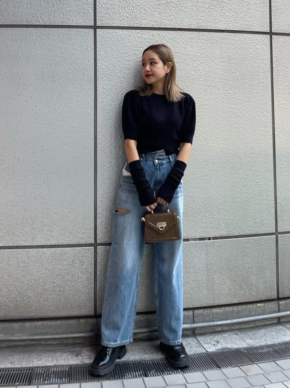 【秋のトレンドニットコーデ🍂】 【ニット】 トレンドのアームウォーマーがセットになったハーフスリーブニット♡ 前後2WAYなのでお好きな方で着用できますが私はデザインがあるフロントボタンを正面に着用してみました♪柔らかいモチっとした、素材なのでチクチク感もなく着用できます! 【デニム】 164cmでSサイズ着用です。 サイドにトレンドのスラッシュが施されており、 EVRISの中では丈感が少し短めの作りになっています! ウエストにデザインがあるのでインスタイルの際によりオシャレに☺️ 【bag】 大人気アイテム! クロコ素材でショルダーは2パターン付きなので3wayで着用できます!人気のチェーンショルダーもついてます♡ 【シューズ】 24.5cmでLサイズ着用です。