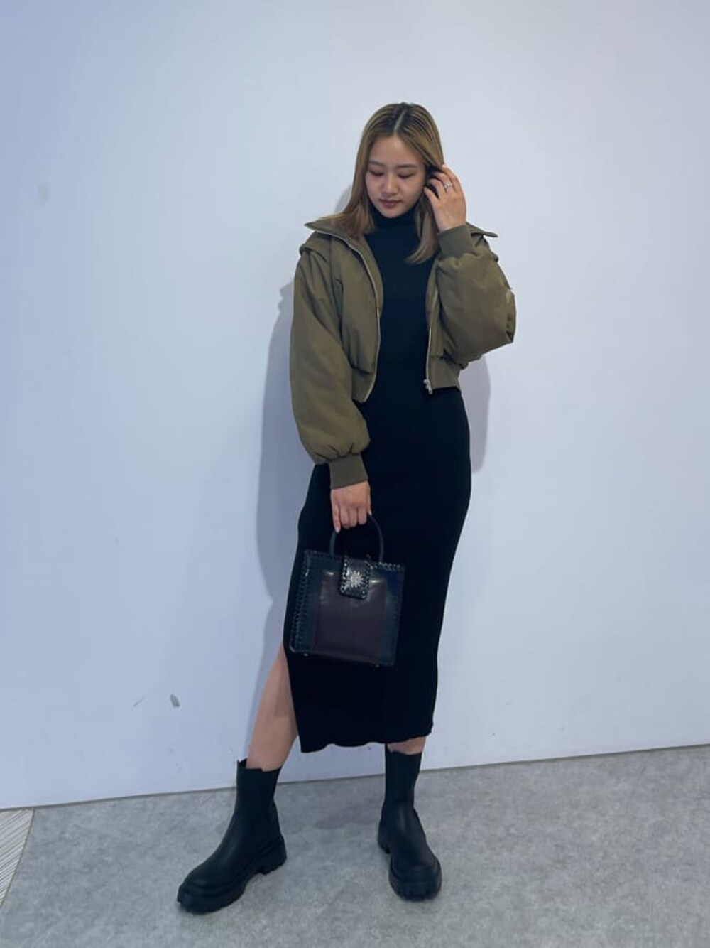 【10月のおすすめコーデ🍁】 【ワンピース】 かなり伸縮性のある素材なので着やすく、 164cmで丈感がふくらはぎの真ん中くらいなので幅広い身長の方に着ていただけるワンピースになっています!サイドに深めのスリットが入っているので女性らしい印象にもなり動きやすさ◎ タートルネックですが、ノースリーブなので秋にかけて着ていただけます! 【アウター】 2wayで腕が取り外し出来るブルゾン! ショート丈なので色んなコーデに合わせられ、袖を取り外しノースリーブになるのも着回ししやすいですよね♡軽めの着心地で首周りのリブが太めなのでマフラー要らずで首元カバーできます! 【bag】 ペットボトルが入るサイズ感です! 落ち着いたら色味のバイカラーなので大人っぽい印象に♡ショルダーも付いているので2wayで持ち運べます👍 【シューズ】 トレンドのサイドゴアブーツ! 24.5cmでLサイズ着用です。