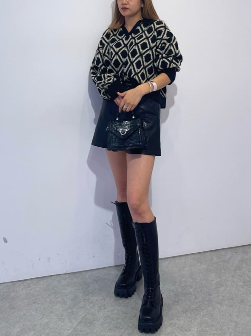 【秋の柄ニット~大人カジュアル~】 【ニット】 ダイヤモチーフの柔らかニット♡トレンドの襟付きなので肩落としで着るのも可愛い◎Vネックなので顔周りがすっきり見えし柄物でも大人っぽく着用出来るアイテムです☺️ 【パンツ】 毎年おなじみのレザーショートパンツ! ウエストの後ろはゴムになってるので履きやすい◎ 太ももに隙間が出来る作りなので細見え効果も👍 【bag】 大人気アイテム! クロコ素材でショルダーは2パターン付きなので3wayで着用できます! 【ブーツ】 24.5cmでLサイズ着用です。