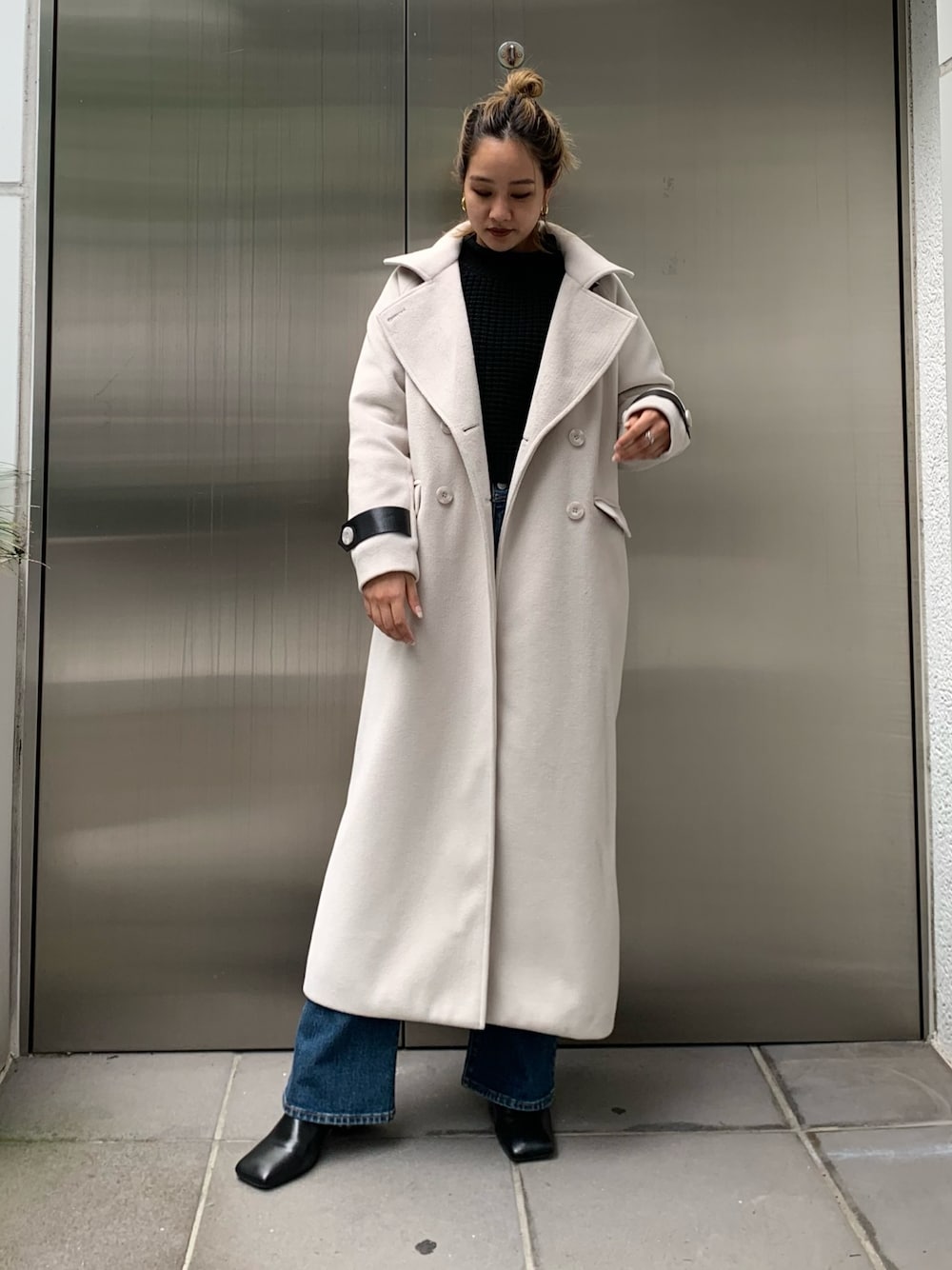 【大人カジュアルコーデ🤍】 tops⇒ポリエステル100%なのでモチっとした素材の軽めなニット!シンプルですが袖に切り替えデザインがあるのもさり気ないお洒落ポイント☺️ショート丈なのでハイウエストのデニムと相性◎ denim⇒ 美脚見えデニム! ワンポイントにポケットにEの刺繍が施されています♡164cmでSサイズでスニーカー合わせ可能です◎ 伸縮性も少しあるため動きやすいです! coat⇒ コート自体のシルエットはとてもシンプルで高身長の方向けのロング丈! 164cmでくるぶしちょっと上くらいまであります😊シンプルなコートの中にEVRISらしいエッジの効いたバックルベルト付きなのがポイント♡ shoes⇒24.5cmでLサイズ着用です。