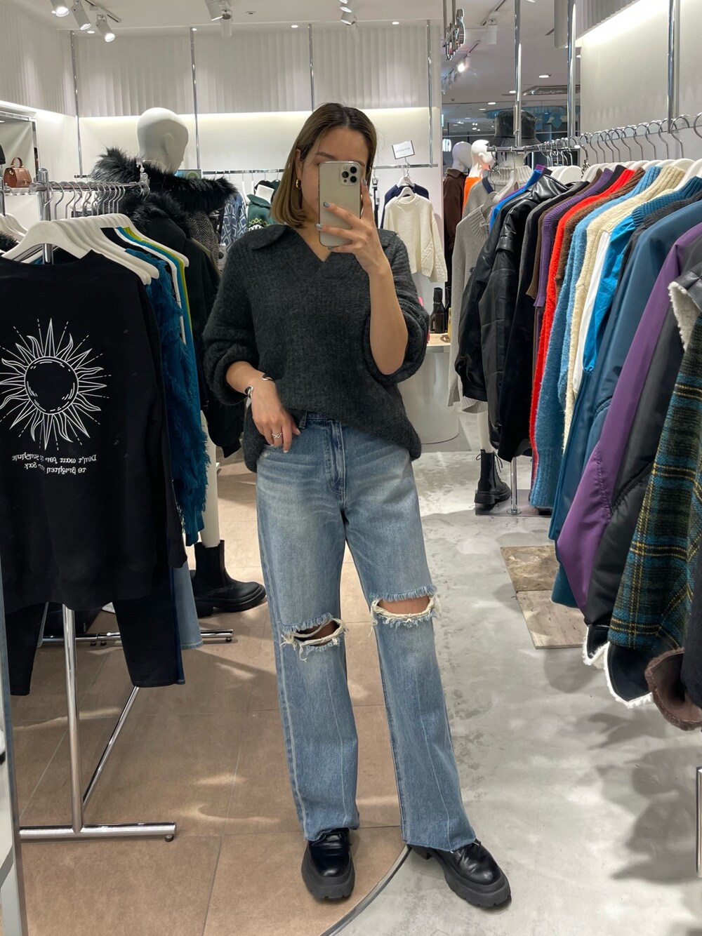【大人カジュアルコーデ♡】 tops⇒ 襟付きのモチっとニット! 丈感は長めで164cmでもヒップが隠れるくらいの丈感なので色んなコーデが楽しめます☺️ 襟が大きめなのでデコルテが綺麗に見えより大人っぽい印象に! denim⇒ 大胆なクラッシュがトレンド感のあるワイドデニム! 膝下からさりげなくセンターラインがあるのでクラッシュから下が長く見えスタイルアップ◎ 164cmでSサイズでスニーカー合わせで着用できます! ワイドパンツでも、太すぎないのでスラッと見えます! shoes⇒24.5cmでLサイズ着用です。 Outer⇒フェイクレザーのダウンを袖を取り外しベストとして着用しています! 164cmでヒップか隠れるくらいなのでオーバーーサイズで着用出来ます!