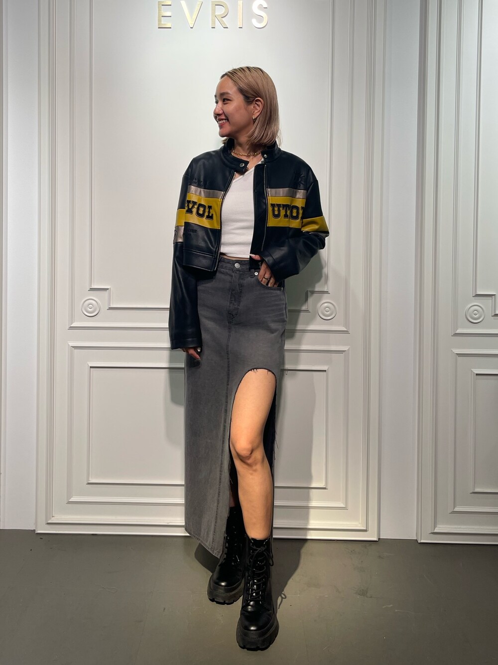 【秋の大人コーデ♡】 jacket ⇒トレンドのショート丈にカラー配色がEVRISらしいジャケット! 大人かっこいい印象なのでミニワンピやスカートと合わせることでバランス◎ tops ⇒春先まで使えるワンショルtops! ざっくり肌見せが可愛い✨ 締め付け感はなく伸縮性があるので着やすくなっています。 skirt ⇒ディープスリットがトレンドのデニムロングスカート🤍 深めのスリットですがインナーショーパン付きなので安心して履いて頂けます😊 bag ⇒コンパクトなショルダーバッグ。 小物が入れれるポケットがたくさん付いてます! shoes ⇒24.5センチLサイズ着用です。