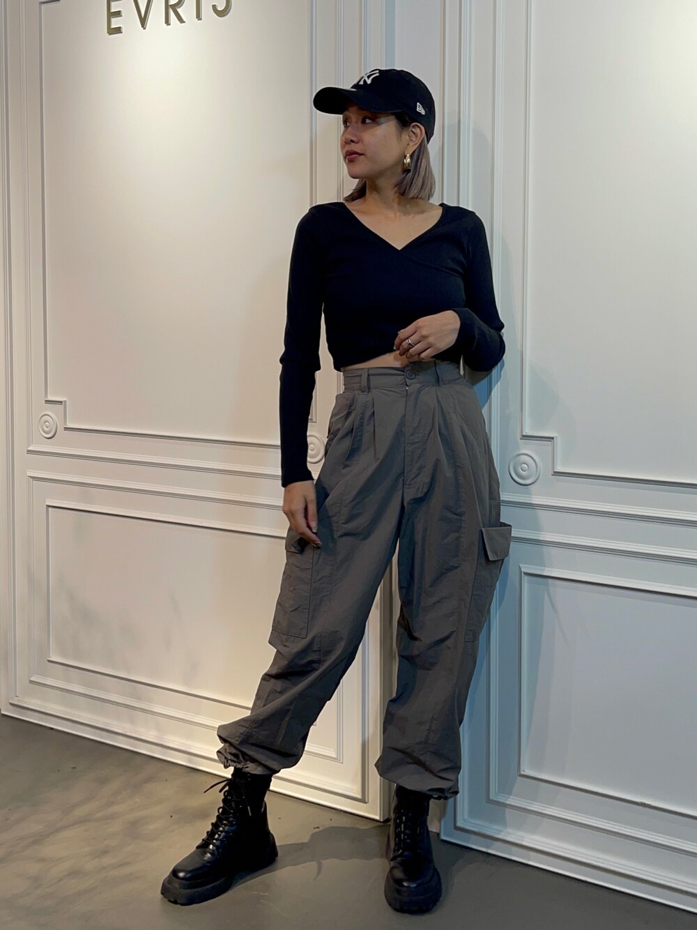 【今年もトレンドのカーゴパンツコーデ✨】 tops ⇒シンプルですがクロスデザインのショート丈トップス! ハイウエストのパンツにはこのくらいショート丈が1番相性抜群ですよ♡ Vネックで顔周りもスッキリ見せてくれます🤲 pants ⇒ トレンドのパラシュートパンツ! ナイロン素材なのでとっても軽い! 脚のラインが出ないので体型カバーにもなり ウエストはピタッとしてるのでスタイルアップ出来るパンツです☺️ shoes ⇒24.5でLサイズ着用です。