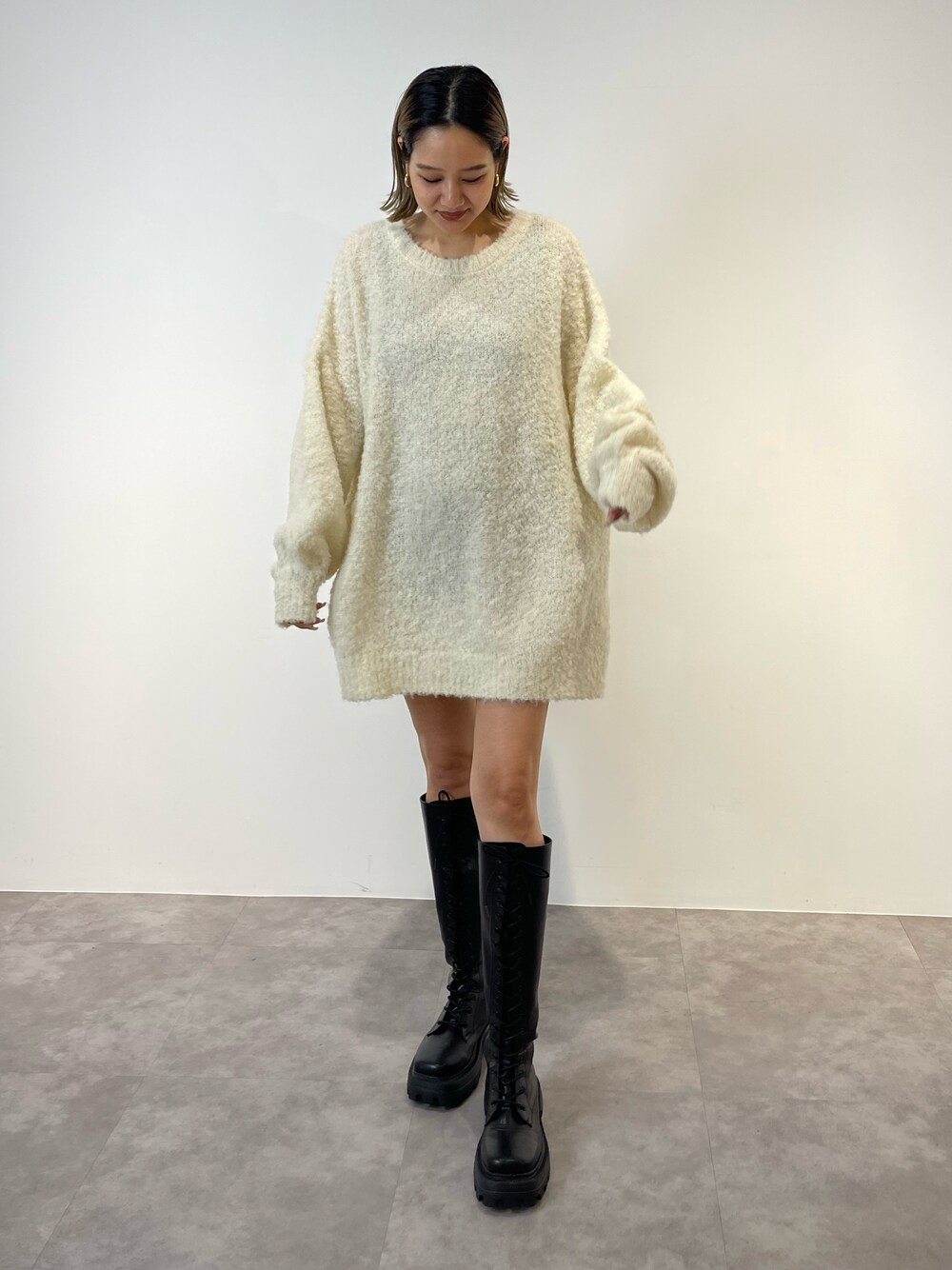 【モテニットワンピコーデ🫶】 knit ⇒ ウール混で暖かみのある柔らかい素材を使用したニットプルオーバーです。 164センチでもお尻まで隠れる丈で1枚でワンピース風に着用できます!! 身幅や袖幅もあえて大きめのサイズにしているので、ざっくりとしたサイズ感で華奢見えさせてくれます🥰ゆたっと感がかわいい♡ shoes ⇒24.5センチでLサイズ着用です。