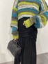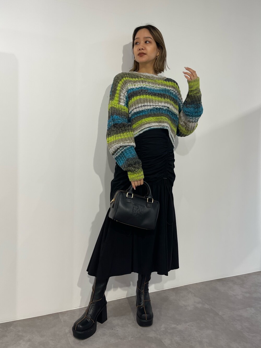 【大人コーデに差し色ニット♡】 knit ⇒ ポコポコした温かみのある糸を使用したニット!厚手過ぎないので秋から着用しやすいアイテム! マルチボーダーの配色がEVRISらしさもありつつ 暗くなりがちなコーディネートを明るい印象にしてくれます👍 ショート丈にたっぷり袖のバランスがかわいい☺️ skirt ⇒ ドロストのデザインがポイントとなったロングスカート☺️ ドロストで調節可能なので木の実の丈感で着て頂けます✨ さり気ない肌見せも可愛い♡ shoes ⇒24.5センチでLサイズ着用です。
