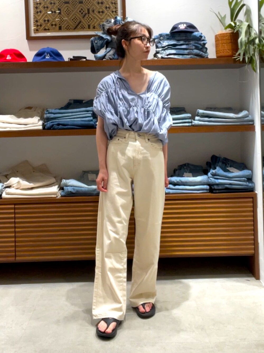 👚ノースリ仕様ですが肩まで袖があるので 二の腕もすっきり見えします☺️☺️ 👖店頭でも大人気のデニム!! ルーズすぎずタイトすぎない絶妙なシルエットになっています🪽 160cm / 24インチ くるぶしにかかるくらいの丈感です!