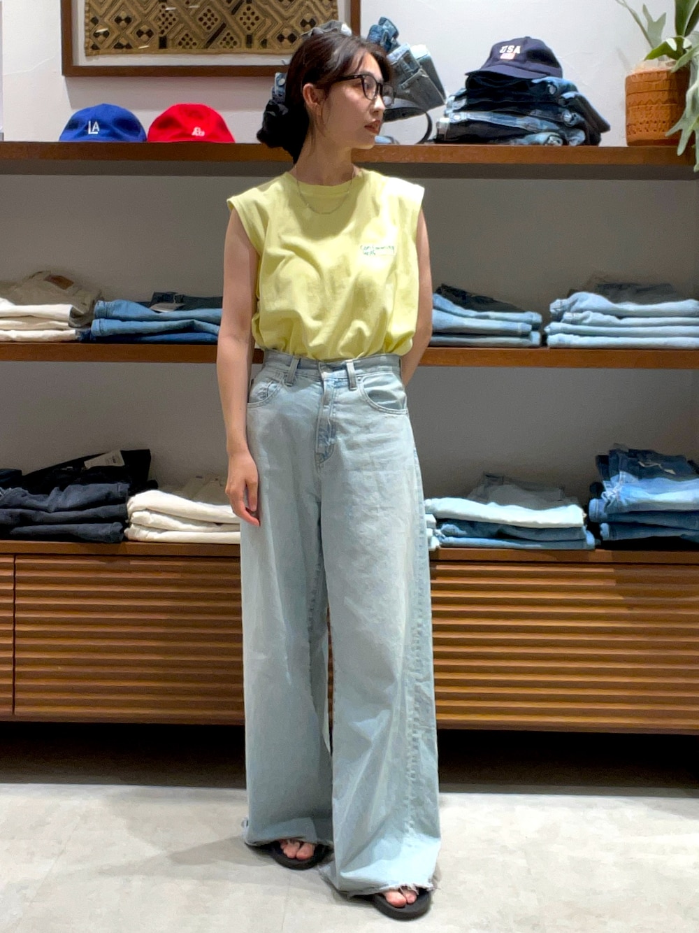 🎽ロゴの刺繍が可愛いタンクトップ! ワンピースのインナーにもおすすめです♡ 👖ボリューム感がありながら脚をきれいに見せてくれます! 裾もカットオフになっていて可愛い☺️☺️ 160cm / 24インチ着用 床ギリギリくらいの丈感です!