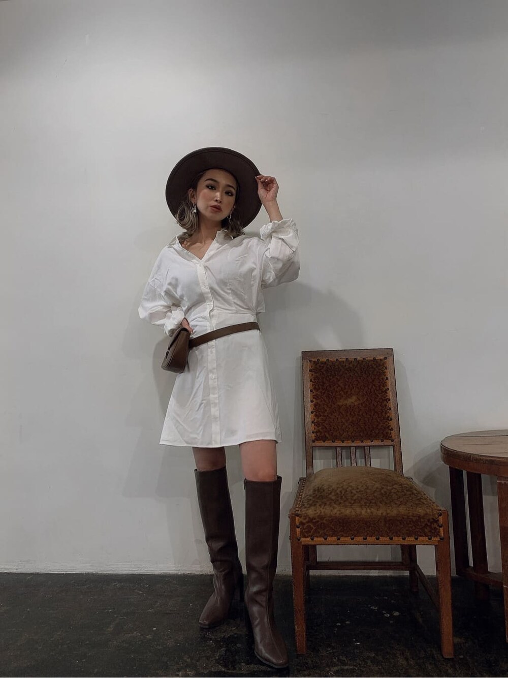 1枚でワンピースとして使っていただけるシャツですがシンプルなデザインなので小物などでスタイリングして頂きやすいです!上からニットベストなど着用しても可愛いです!
