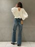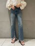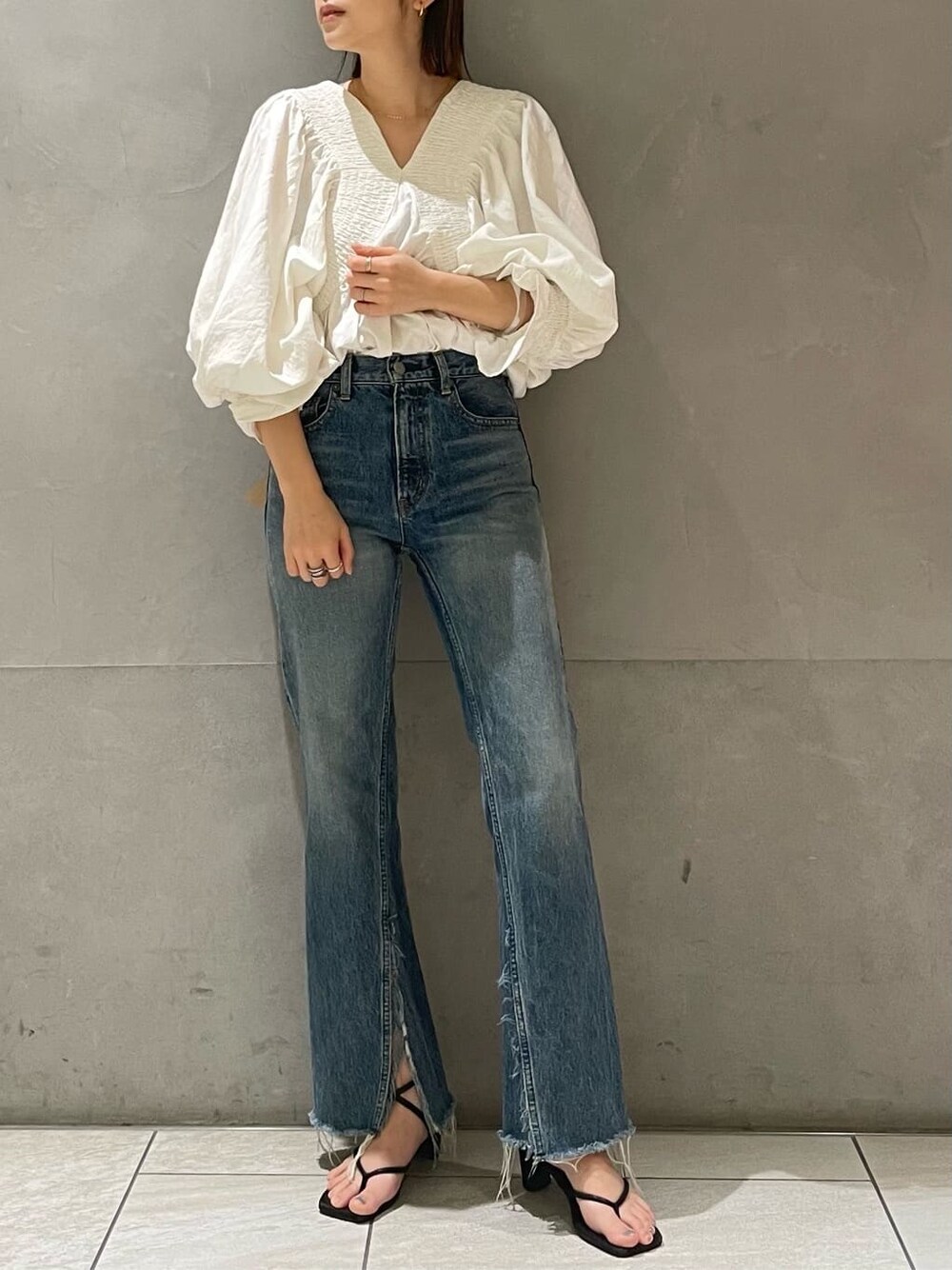 ブラウスは、フロントのギャザーが目を惹くデザイン。Vネックデザインがデコルテを綺麗に見せてくれてスッキリ見えますよ! ボドムは、フレアのハイウエストシルエットが足を美脚に長く見せてくれるデニムです♡これから夏に向けてシンプルコーデが増える中足下のスリットがワンポイントになります。