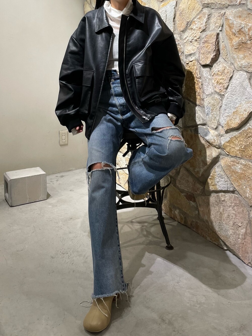 お問い合わせ多数の大人気ブルゾン♡ 肉厚な生地感と表情のあるフェイクレザーが高見えします✨着心地もとっても軽くてアーム周りもゆったりしてるので寒くなっても着込めます♡ デニムと程よい加工感が可愛いのでシンプルなトップス合わせがおすすめ✨