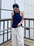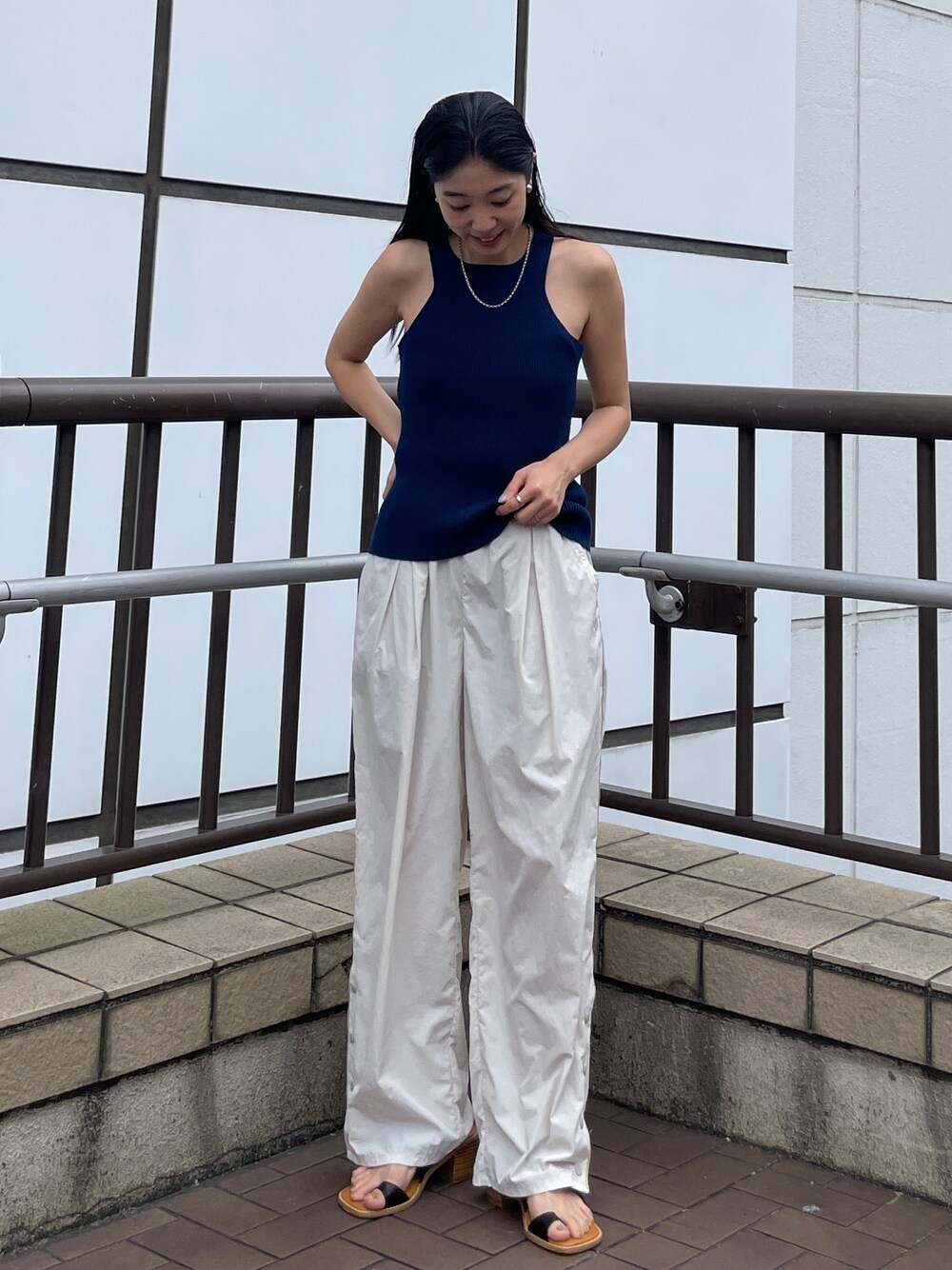 肩周りを華奢に見せてくれる優秀タンク✨生地も程よく肉厚なので身体のラインを拾わないです!!色もネイビー大人目でかわいい✨パンツも軽めの素材感で履き心地楽ちんです!裏地もハーフ丈なので涼しく着れます♡シューズもヒールに安定感が履き心地楽ちんで一日店頭で履いていても疲れないです✨23.5cmの足サイズでM着用です!