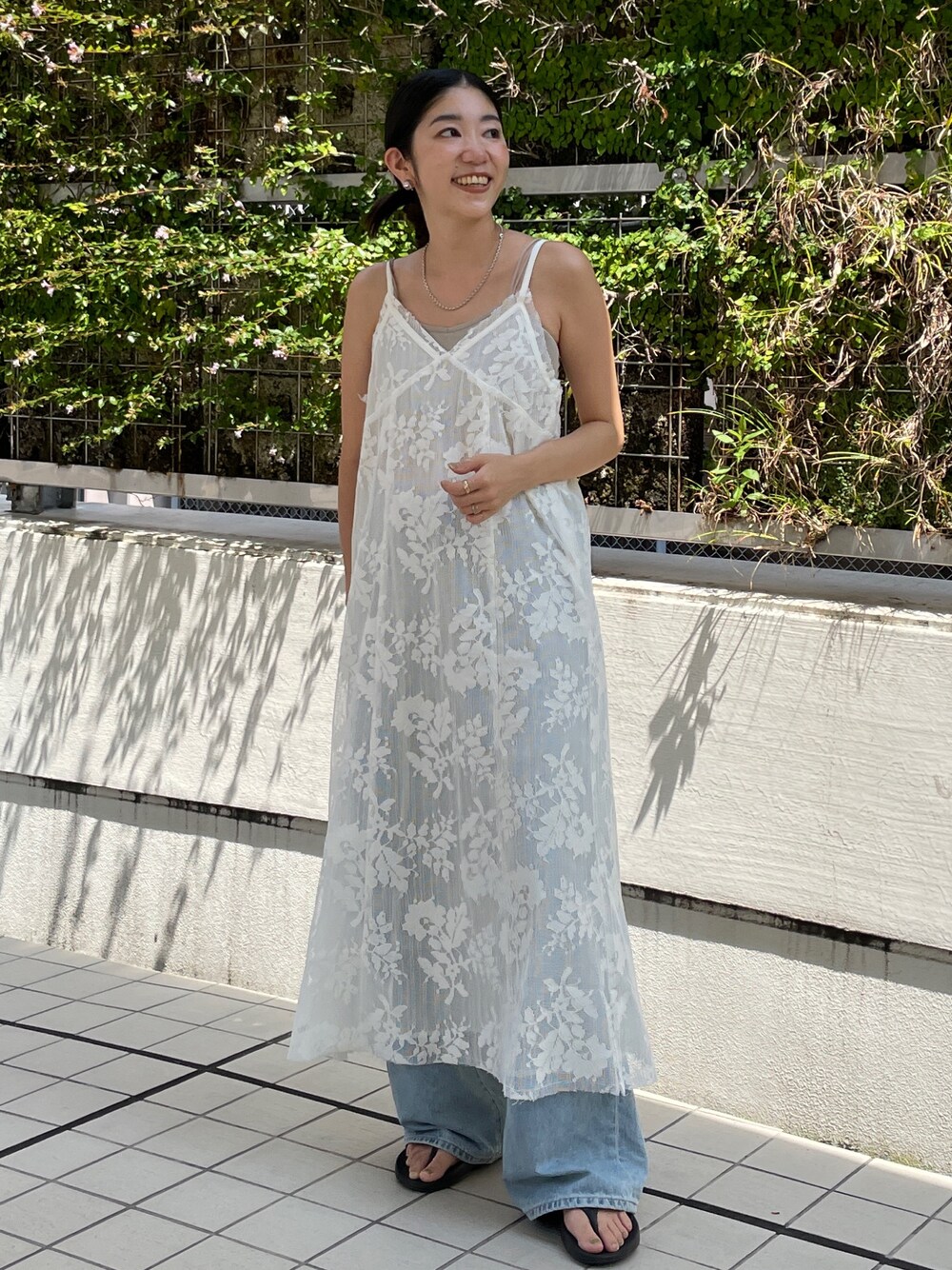 トレンド感あるレースキャミワンピースは着回し力も抜群で今季持っておきたい1枚です🤍今から着るならキャミやteeをインナーにしたり、秋はロンteeやスウェット、ニット、ジャケット合わせもおすすめです😊アジャスターで丈の長さを調節できるのでデニムなどレイヤードする時は少し短めにしても可愛いです♡ インナーは華奢なストラップなのでインナー感が出なくてレイヤードやインナーとして合わせやすいです! デニムは程よくボリュームのあるシルエットなのでスッキリしたトップスの合わせで今ぽく着たり、ワンピースに合わせてずるっと裾だけ出しても可愛いです💓