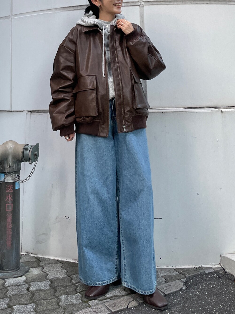 レザーブルゾンは昨年も人気のアイテムが今年も再販しました♡とっても軽くて中綿も入っているので秋から冬までインナーを変えて楽しめます🍂⛄️✨厚地のスウェットやニットも入るぐらいアームがゆったりしています!! ニットパーカーはフードと取り外し可能なので首周りをスッキリしたいときなども便利です😚 デニムは158cmで24インチがスニーカーでも引きずらずに履けます♡ボリュームのあるシルエットなのでトレンドのショート丈のトップス合わせもおすすめです✨ ブーツは普段23.5cmでMサイズぴったしでした👞✨ヒールも安定感があってとっても履きやすいです!