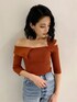 アシンメトリーデザインのオフショルがポイント♫ビビットカラーとブルーのデニムを合わせることで、より春夏らしい印象になります♡ボトムを選ばない1枚なので様々なスタイリングが楽しめます✌︎