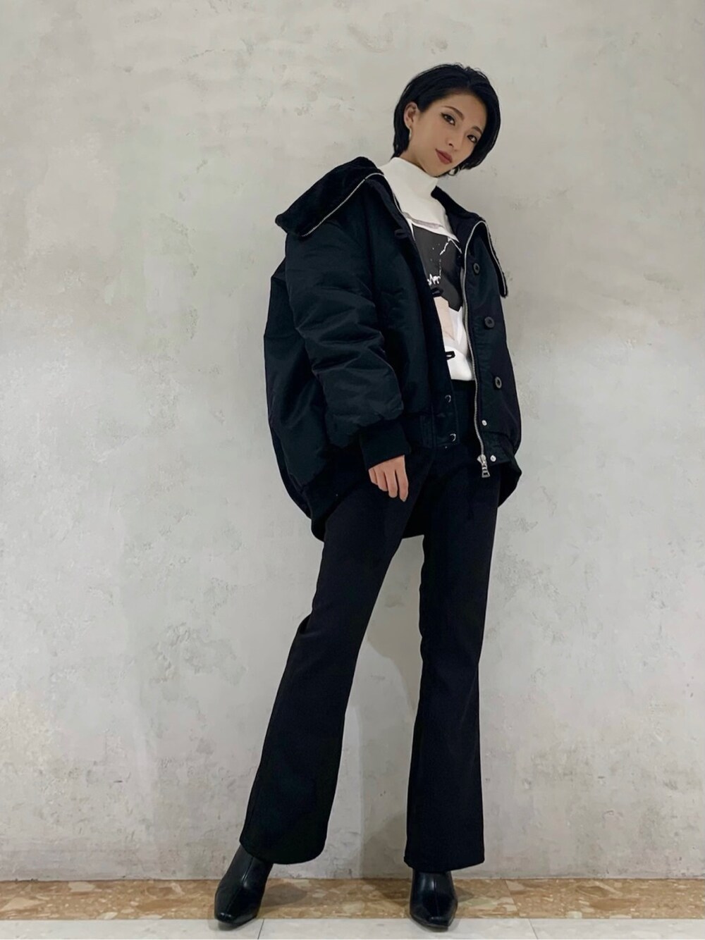 永田悠莉(EMODA)のブルゾン「フェイクファードッキングワイドカラーブルゾン」を使ったコーディネート