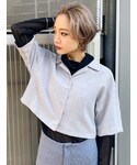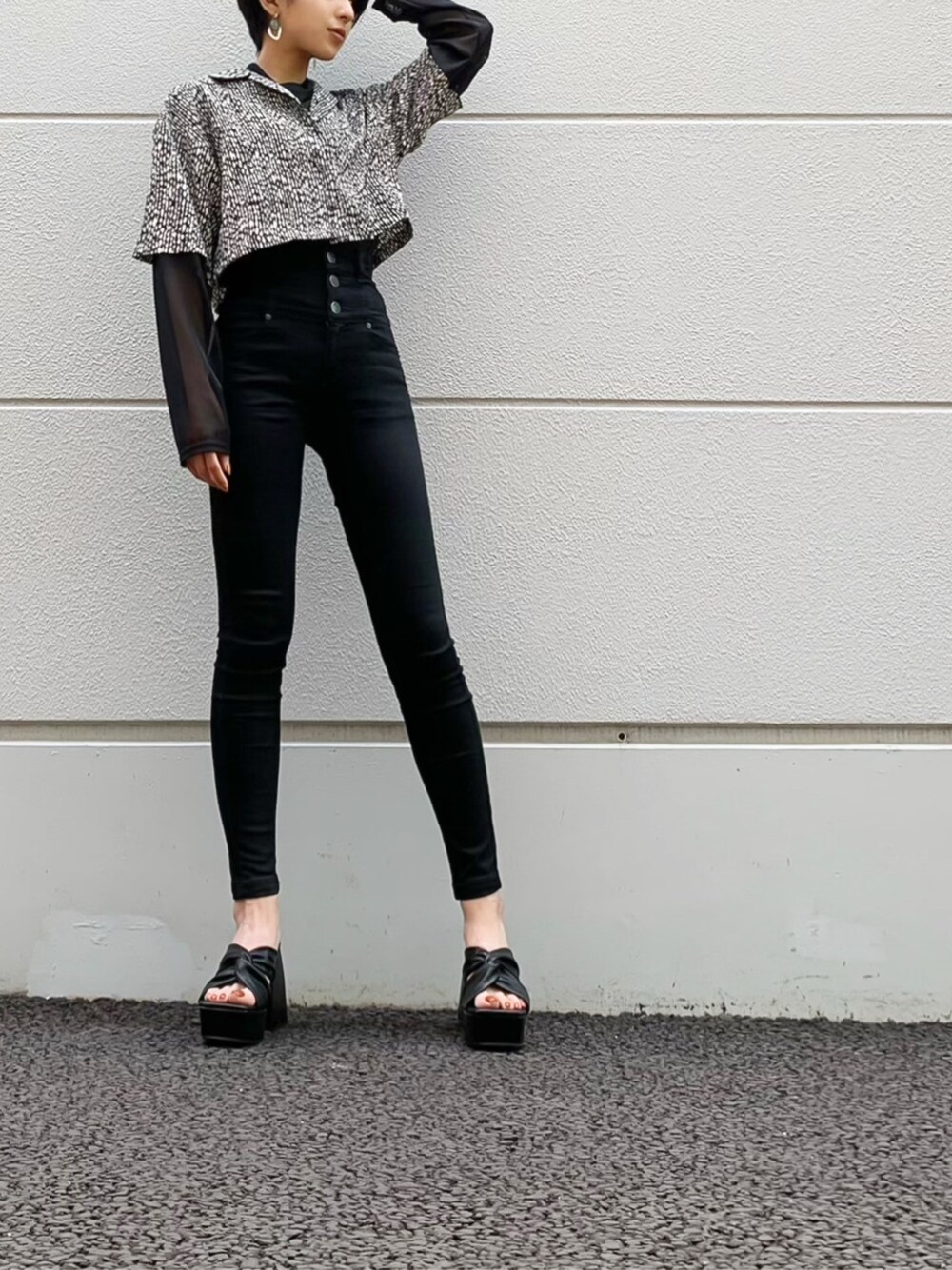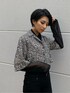 ショート丈でEMODAらしい開襟シャツ♡トップスとしても羽織としても使えるので1枚あると着回しに便利✌︎まだ少し肌寒い日は、シアーロンTの重ね着がオススメです☺︎こちらのEMODAオリジナル柄をポイントに、他を黒でまとめてモード感を出しました‼︎