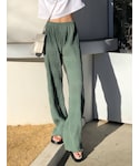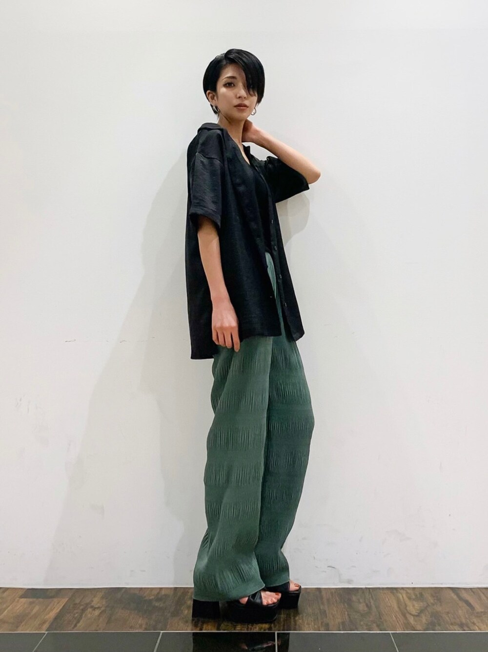 昨年も大人気だったシャーリングパンツ♡今年は緑をGETしました✌︎全体のシャーリング加工が足のラインをカバーしてくれます♡ウエストゴム仕様で、とっても軽くて履き心地も抜群‼︎私はシャツを羽織ってかっこよくしてみました☺︎パンツのカラーが映えるように、黒でまとめてます♪オーバーサイズのTシャツと合わせてカジュアルにしてみたり、同生地でトップスの展開もあるのでセットアップの着用もオススメです♡