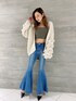 袖にあるポンポンデザインがお洒落なカーディガンです。ボリュームのあるカーディガンなのでタイトなビスチェと合わせるとすっきりとした印象にしてくれます。肌寒い今の時期だとシャツやジャケットを中に着て頂いてもお洒落に着て頂けます。他ではないスーパーフレアパンツは、太ももから膝にかけてはぴたっとしてるのでシルエットもとても綺麗で美脚効果も抜群です!