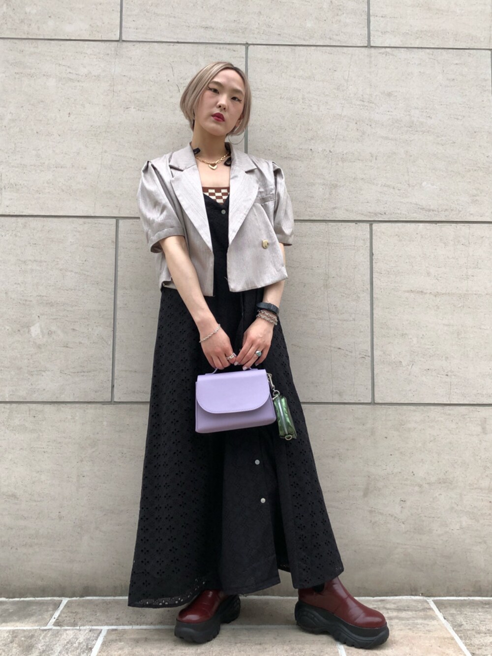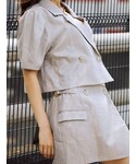 ワンピにショートジャケットを羽織って腰位置を高く脚長効果に見せているのがポイント。 ワンピのボタンは貝殻の様なボタンで光で見え方が変わります。 Tシャツ合わせでカジュアルに着こなしても可愛いです☺︎