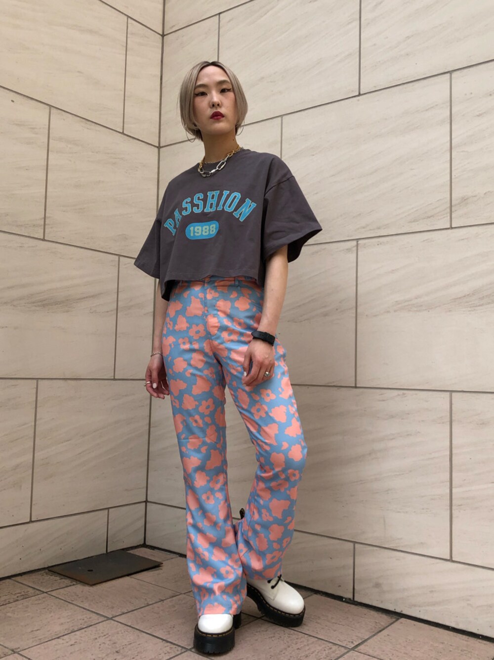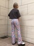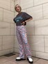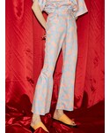 シンプルなデザインのクロップド丈のトップスに柄のフレアパンツ。 胸元デザインのカラーと合わせて統一感を。 パンツのウエストはゴムではないですが、サイドのベルトで調節ができます。 ゴムではないので後ろからのシルエットも綺麗です。