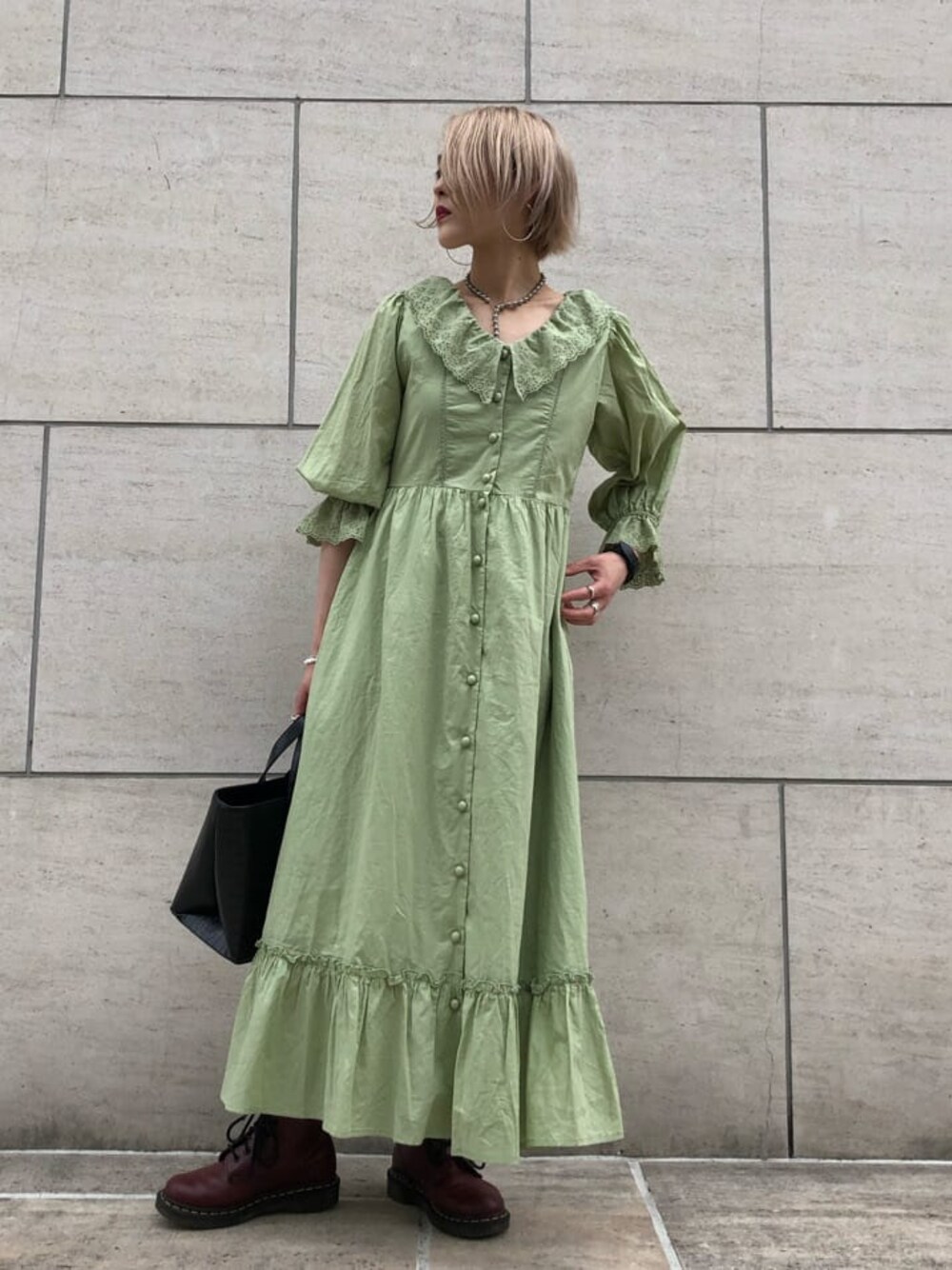 ヴィンテージ感が可愛いカットワーク刺繍の生地を使用したワンピース。 前開きのワンピースは羽織としても着れます。 セットでついてるリボンは首に巻いてチョーカー使いや腰に巻いてウエストマークに使っても良し◎ マーチンと合わせてガーリーになりすぎないコーデに。