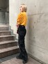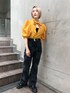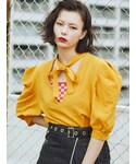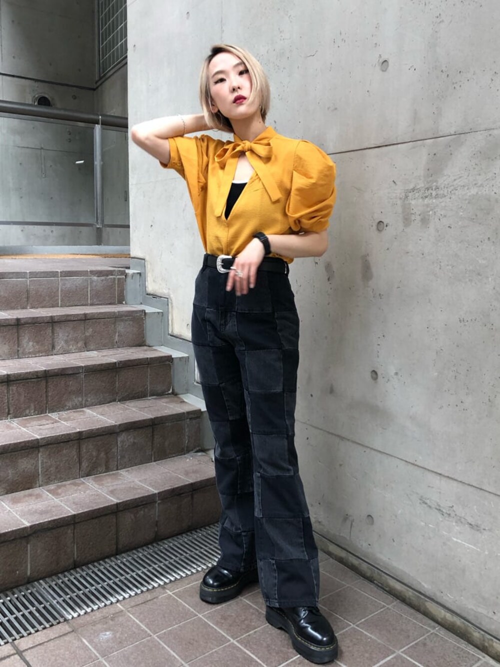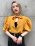 前後どちらを前にしても使えるトップス。 今回は前リボンにしてみました☺︎トップスのカラーを際立たせる為にトップス以外をブラックに統一。ボリュームスリーブで二の腕周りを隠せ、前リボンで着ることでデコルテラインが程よく出るのでパンツスタイルでも女性らしさが出せます☺︎