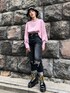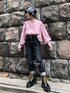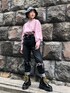 特徴的なスリーブを活かしたコーデ☺︎ 【ブラウス】モモンガのような広めのスリーブで華奢見えでき、少しラメ感のある素材で上品にも着れます。 【パンツ】XSを着用。ロールアップ部分を下げるとくるぶしが隠れるぐらいの丈感。膝のダメージは曲げた時にちょうど膝の位置にくるので動きやすいです。着用していくと少しずつダメージの広がりがあるので、ヴィンテージ感を楽しめます☺︎
