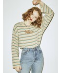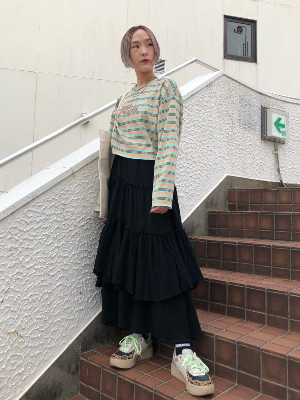 楽チン古着風カジュアルコーデ☺︎ 【トップス】ショート丈のロンT。キャッチーな配色がレトロ感を演出◎裾と袖は切りっぱなしのデザインになっておりヴィンテージ感も楽しめます。 【スカート】ボリュームがあるけど着膨れしないティアードスカート。ウエストはオールゴムで楽に履けます。154cmでくるぶしより少し上の位置の丈となりぺたんこシューズでも履きやすいです☺︎