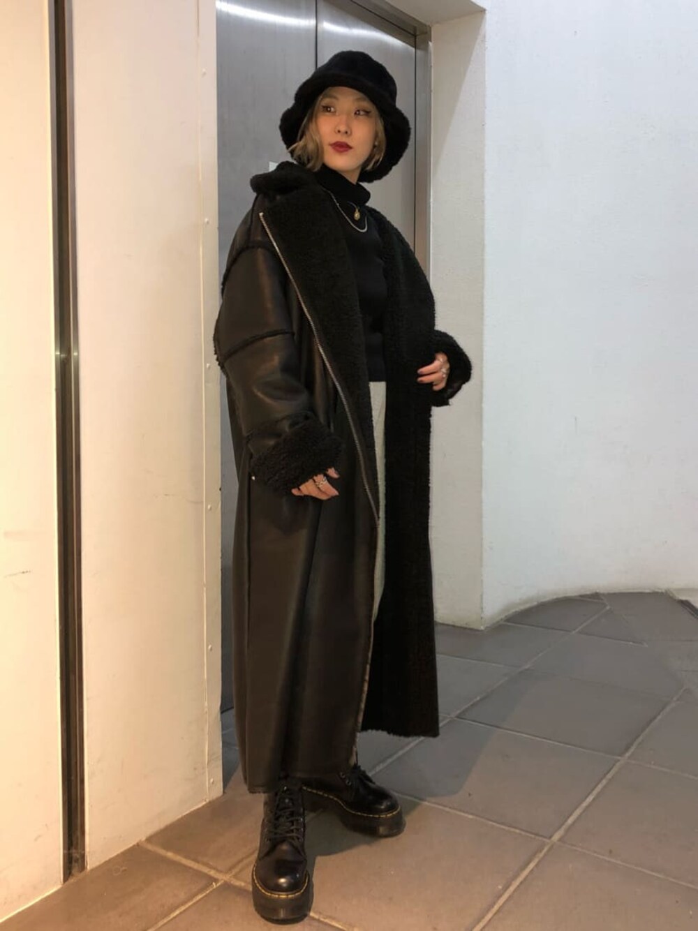 モノトーンストリートコーデ☺︎ 【アウター】ライダースディテールのロングコート。154cmでもくるぶし上ぐらいで、表面はエコレザーで外気を遮断し内側のファーがしっかり体温を保ってくれます。見た目程重さはないので着疲れしにくいです。 【パンツ】スウェット素材のジョガーパンツ。ウエストはゴムで楽チンに履くことができ、足首がゴム+ベルトで部屋着ぽくならずストリートに着れます☺︎ハイウエストなので、脚長くスタイルアップに◎
