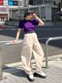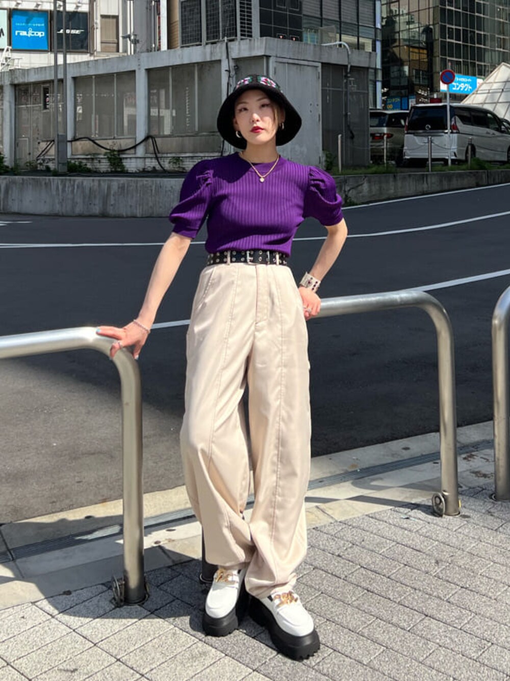 カラーを活かしたストリートコーデ☺︎【トップス】jouetie定番のパワショルニット。サマーニットなので涼しくラメがないのでチクチク感なく着られます◎少し透けるので見せブラやキャミをインナーに着ることをオススメします◎154cmで腰骨ぐらいの丈なのでインもアウトもしやすいです。【パンツ】ルーズシルエットのパンツ。カラーステッチがセンターにある事でお尻や太ももをカバーしつつも短足に見えません。154cmだと床に届いてしまう長さですが、足首周りが少ししぼまっているので靴を履けば床に着きづらくロールアップして履いても◎生地感は薄手でオールシーズンで使えます。メンズライクなパンツなので、どのトップスを合わせてもストリートMIXなコーデにして頂けます。【シューズ】厚底なのに軽いローファー。クッション性のある中敷で長時間履いても疲れづらいです。存在感のあるビットがきれいめにもカジュアルにもスタイリングできます◎【帽子】配色にこだわったクロシェハット。綿100%なので夏は涼しく、冬は保温性があるので暖かくオールシーズン使えます。ツバにワイヤーが入ってるので前側だけアップしたりアレンジを楽しめます◎