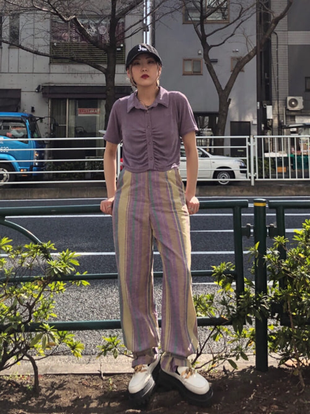 パープルを使ったストリートコーデ☺︎【キャップ】NEW ERAコラボキャップ!後ろでサイズ調整ができ、余ったベルトは隠せれます。シンプルなデザインなのでコーデにプラスしやすいです☺︎【トップス】少しタオル地のような伸縮性のある生地でとても着心地の良いトップス。154cmでおへそぐらいの丈でハイウエストのボトムとの相性◎前のボタンを開けて羽織としても着られます。【パンツ】セットアップ対応のパンツ。足首のベルトは取り外しができ、ベルトループを隠す事ができる仕掛けが☺︎ベルトを外すとストレートパンツの様なデザインになり1着で2通りのシルエットが楽しめます。綿麻の生地でさらっとしており着心地よく涼しげに着られます。【シューズ】厚底なのに軽いローファー。クッション性のある中敷で長時間履いても疲れづらいです。存在感のあるビットがきれいめにもカジュアルにもスタイリングできます◎